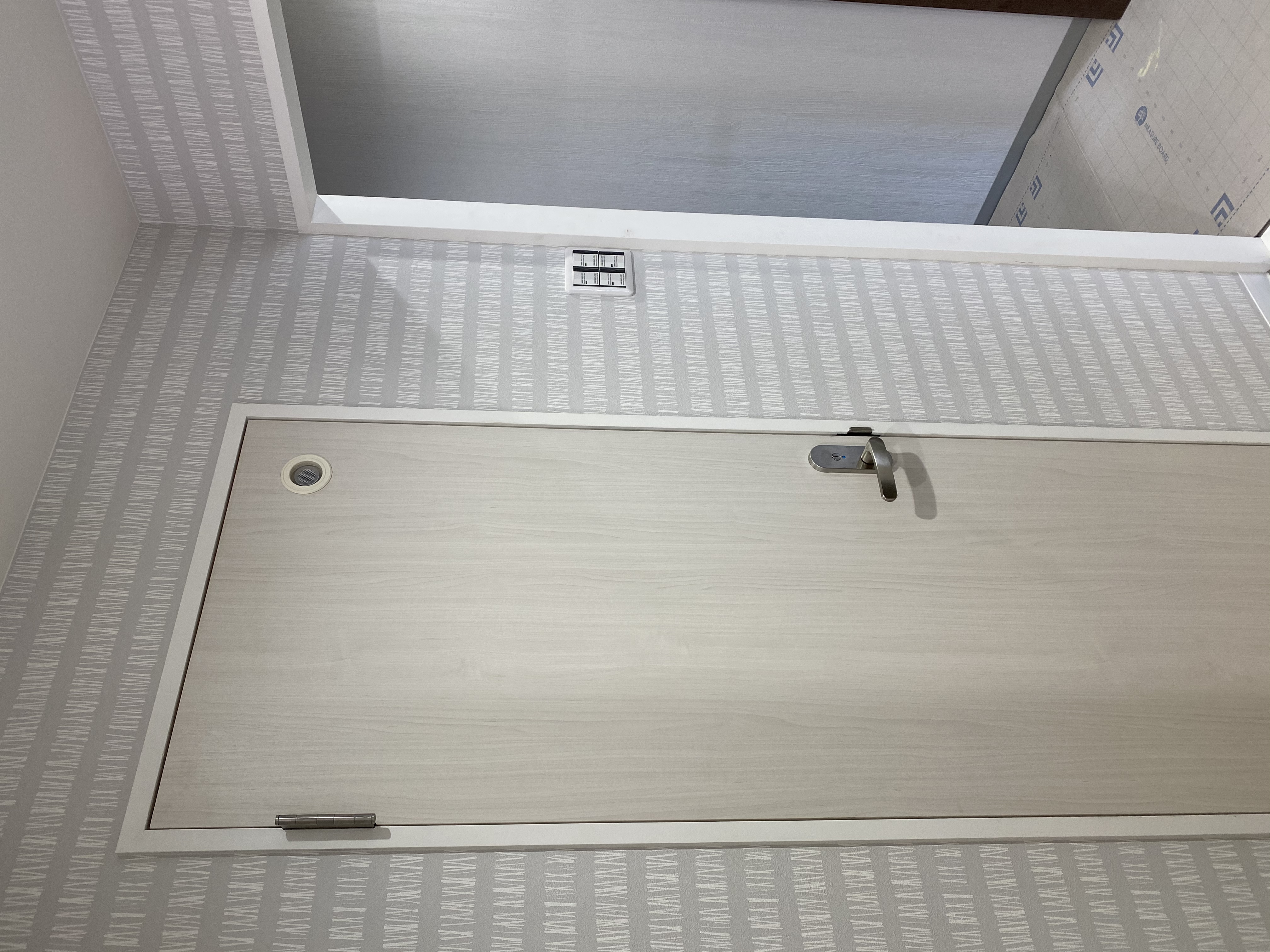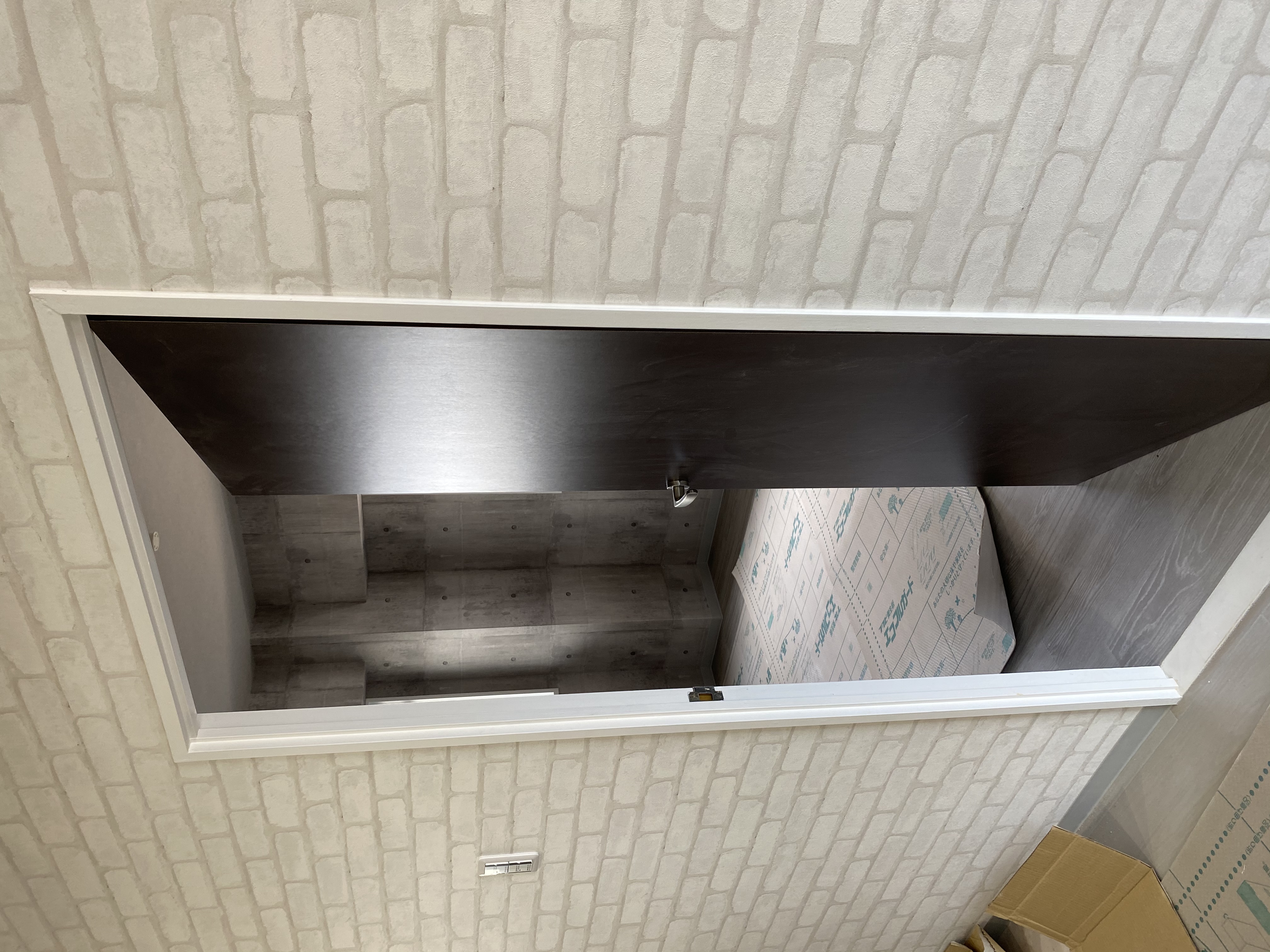 オーダーの建具。洗面台の収納部の白をはじめとした白基調の洗面所です。清潔感あふれております。洋室にはお客様好みのブラウンでソフトウォールナットのドアを。レンガ調のクロスとマッチしております。3月30日で工事完了予定ですのであと少し、、、!
