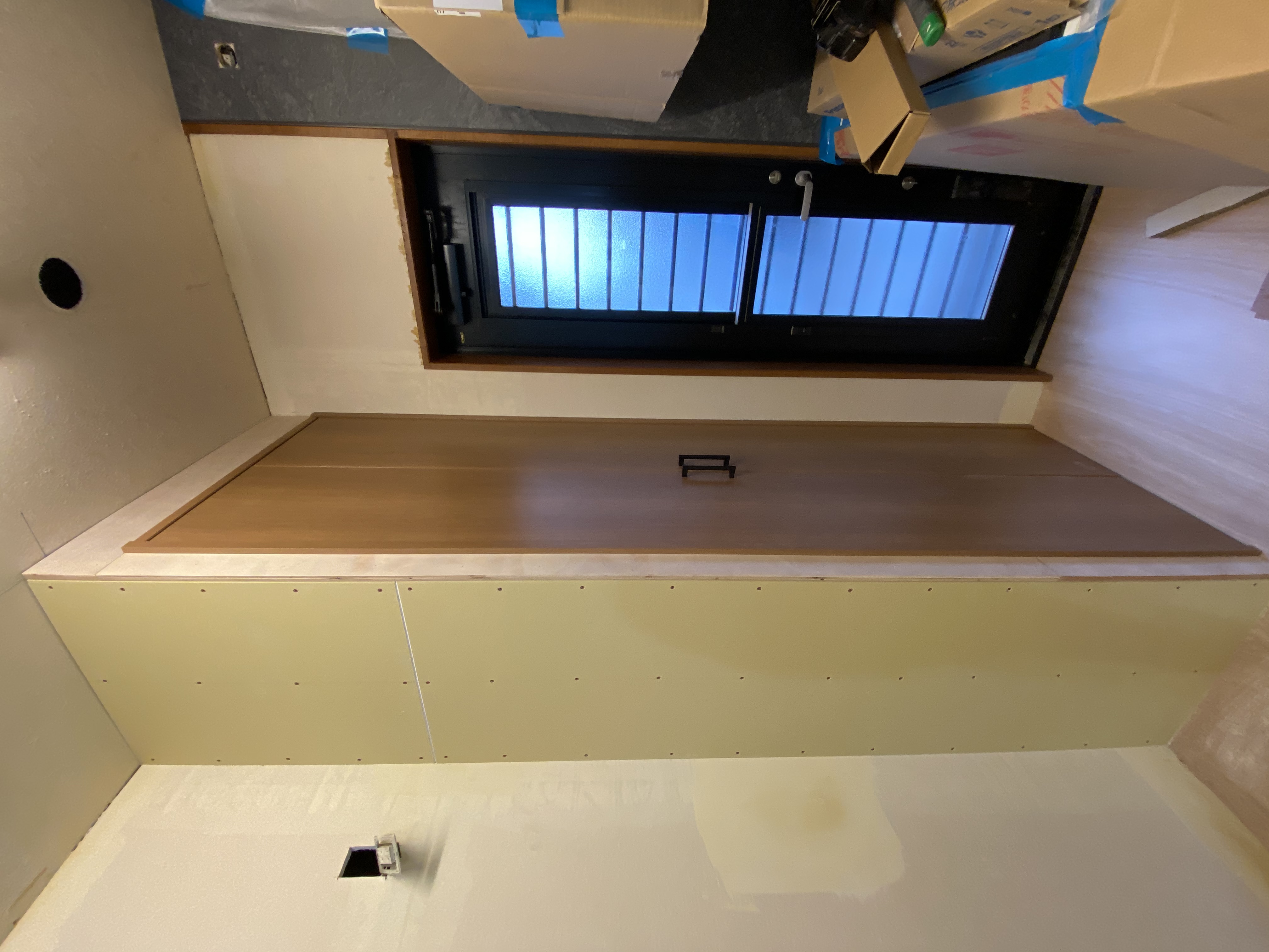 キッチンの後ろにカップボードが出来ていました!そしてこの物件一押しの和室に設けた大きな両引戸も出来ておりました!大工さんの工事も後2日。