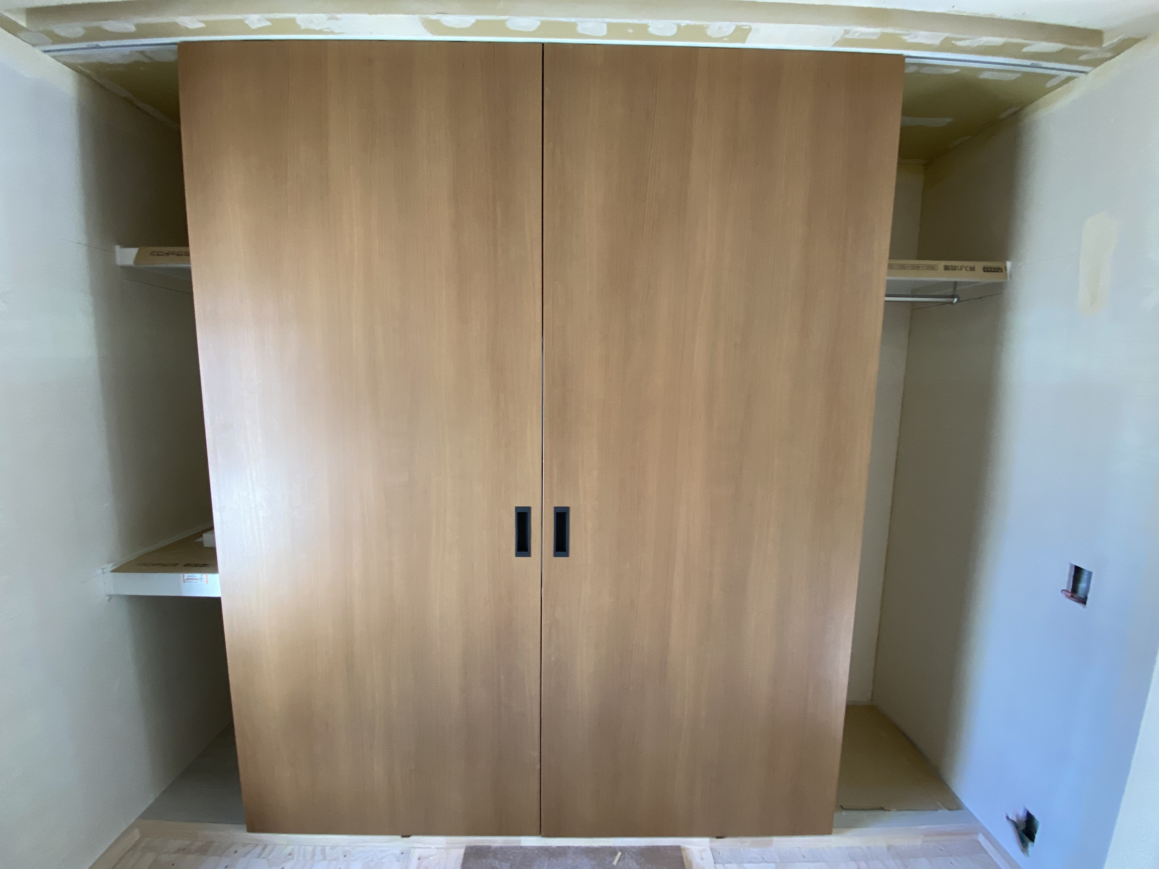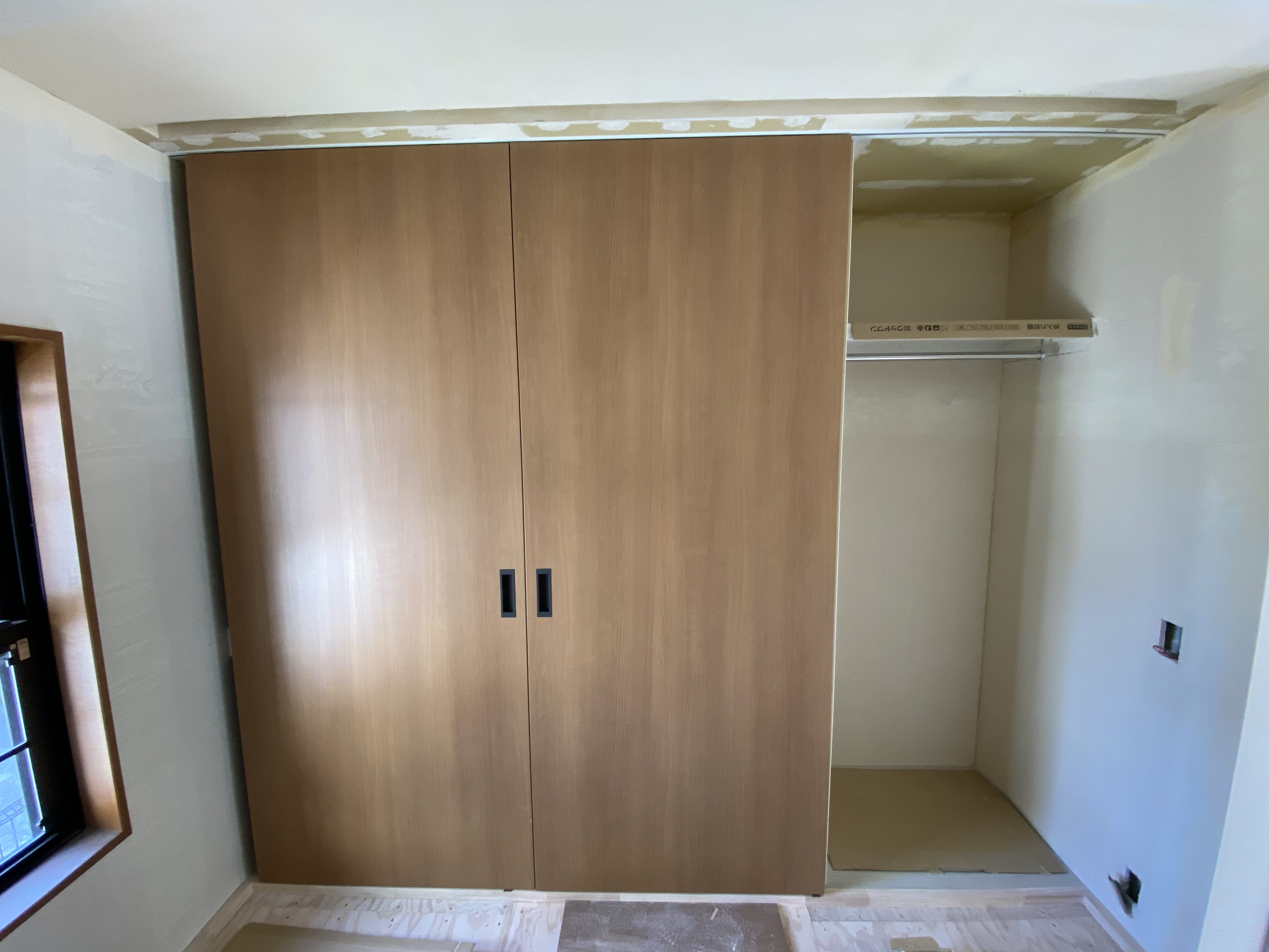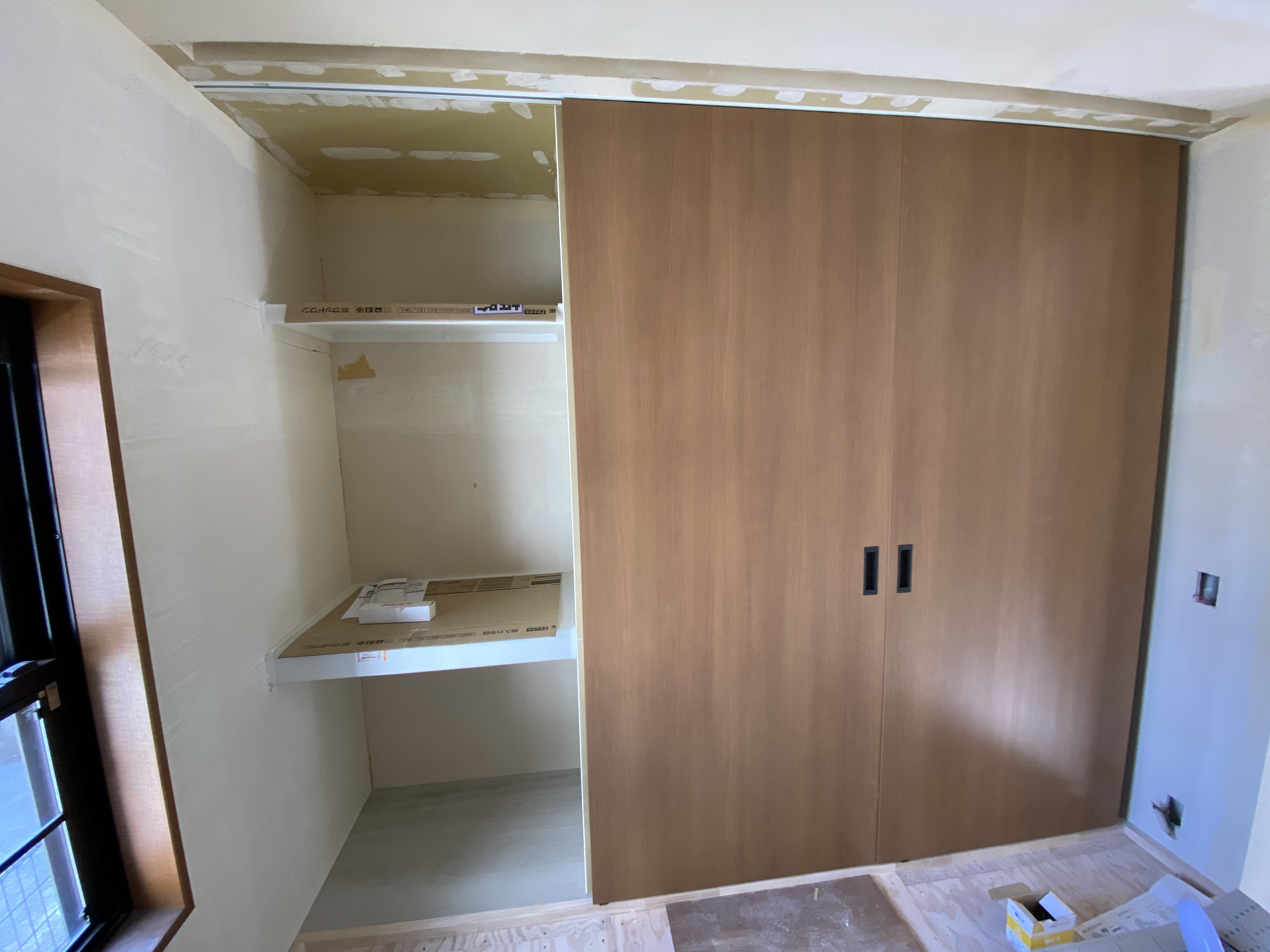 本日、木工事完了日。今回イチオシのドドンと大きな両引き戸の全貌です。いかがでしょう。