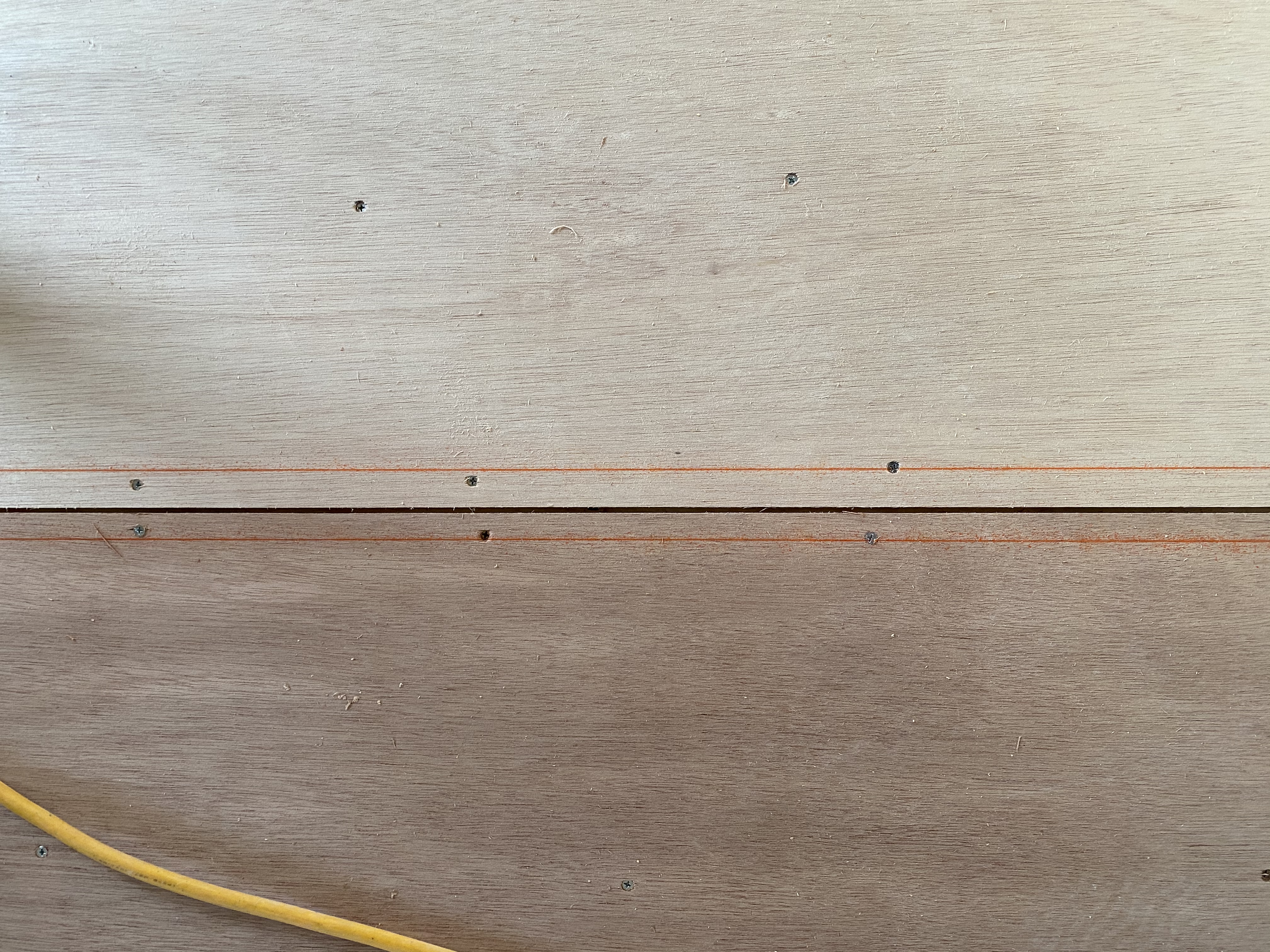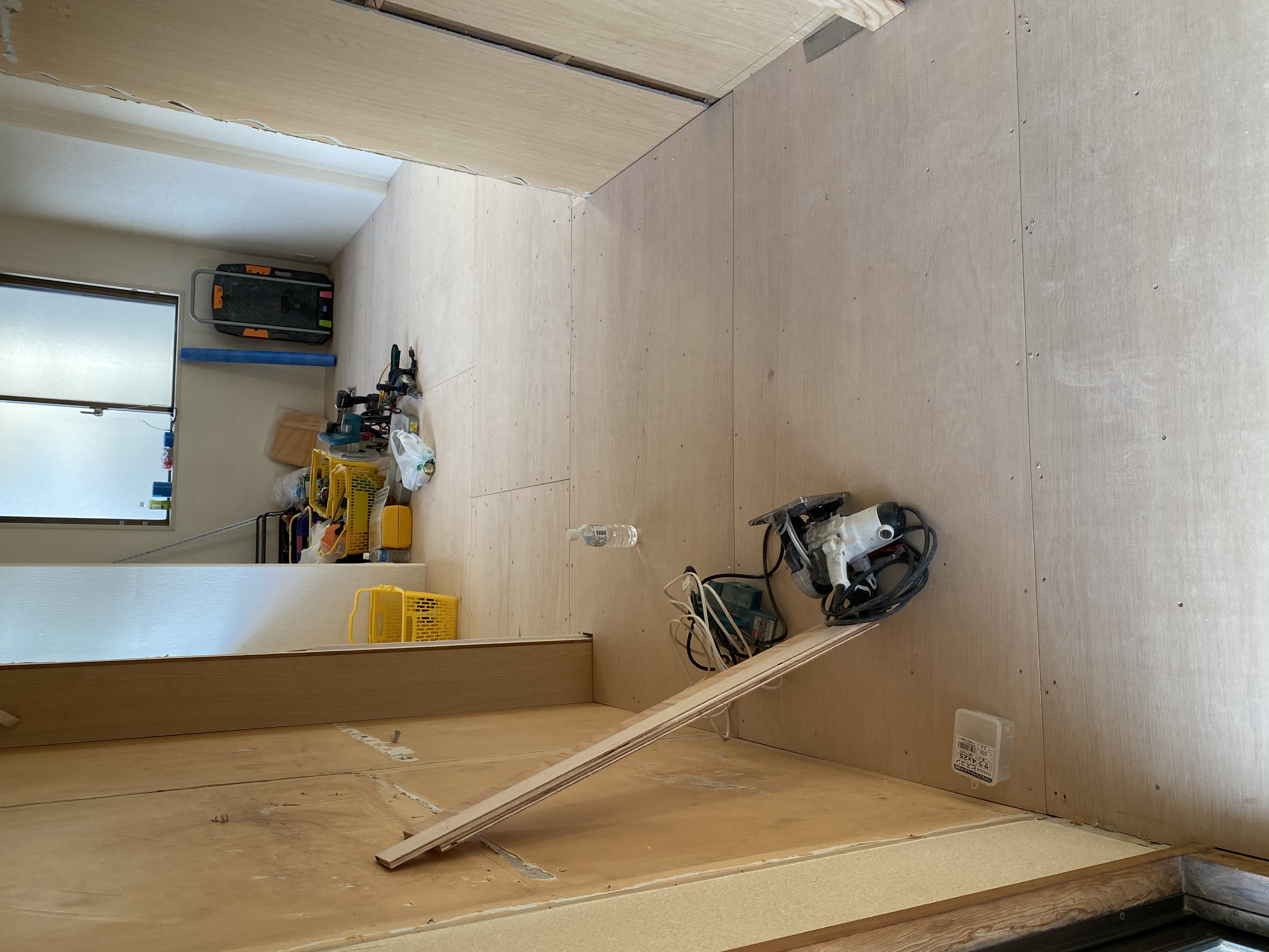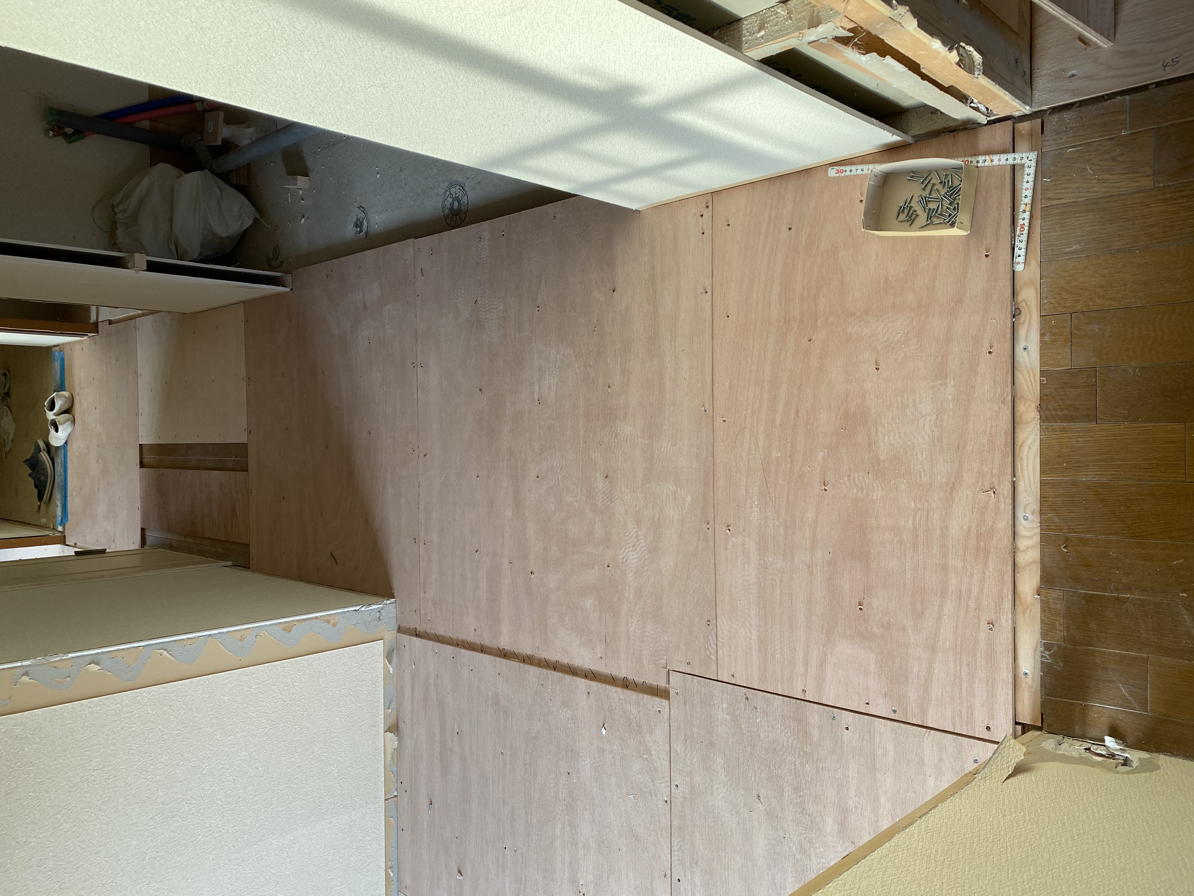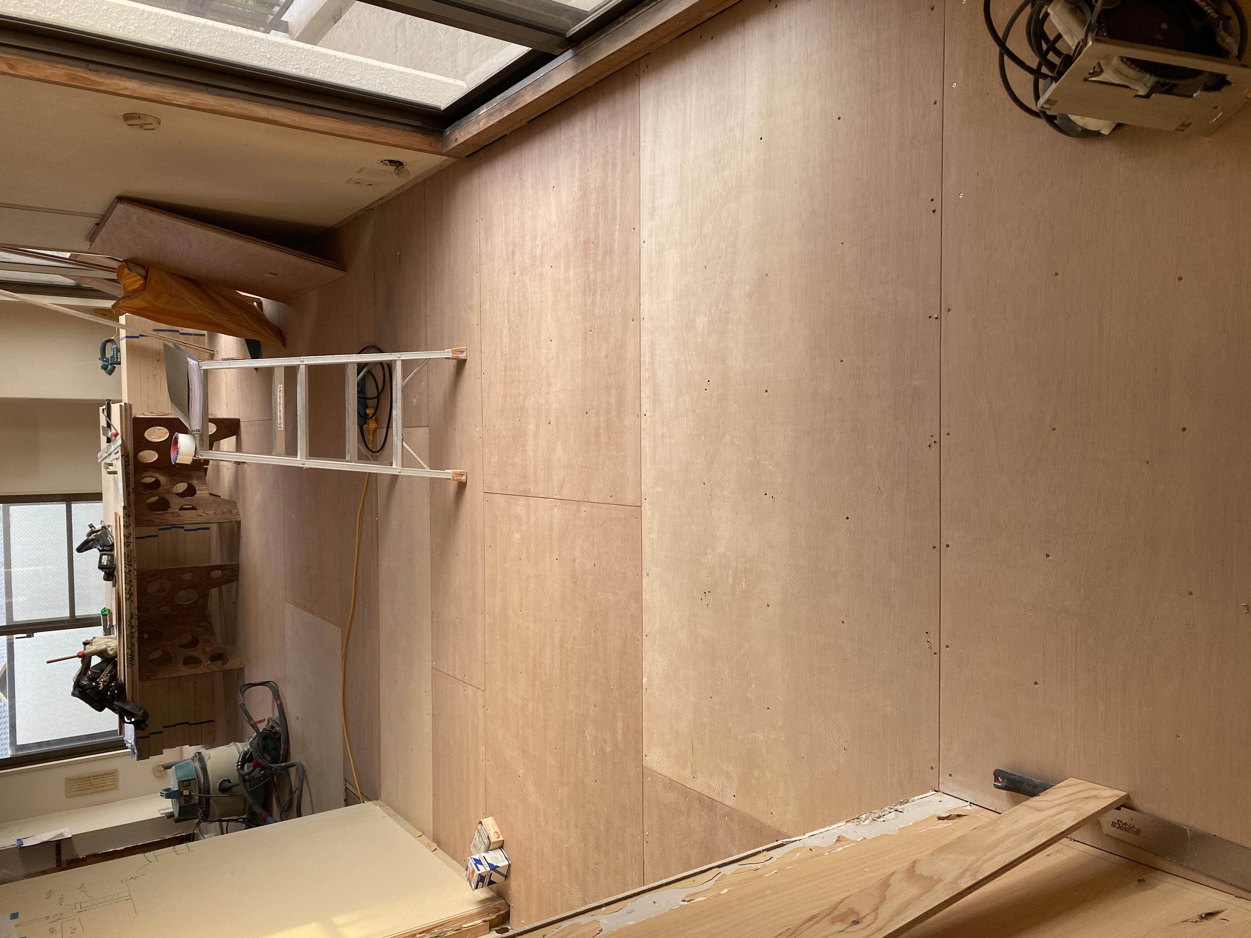 既存の床をリニューアルさせるために大工さんにベニヤ板を貼ってもらいました。既存の床は年数が経つとどうしてもフワフワしてしまうため、それを排除するためにベニヤ板を貼って床を綺麗にそろえてフロアタイルを貼っていきます。