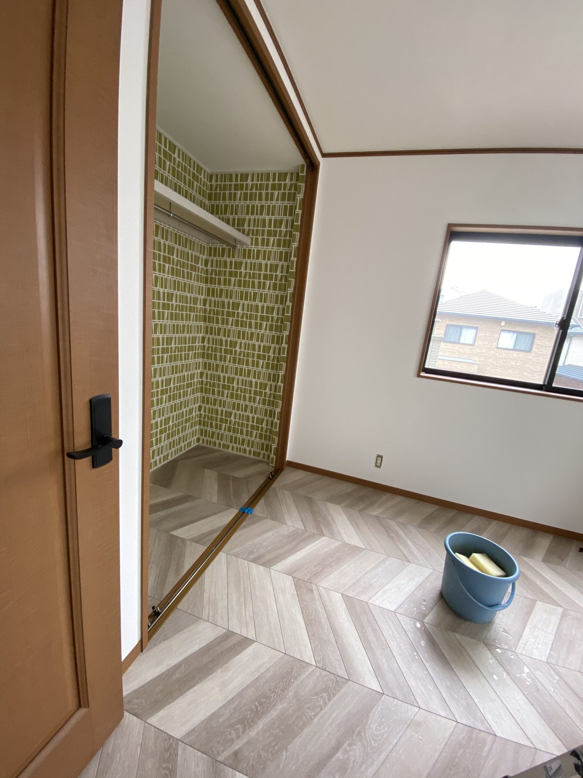 そして二階にもヘリンボーン!今度は床に取り入れました。洋室2部屋分に。。色合いが最高に良くて自宅にもしたくなりました😅