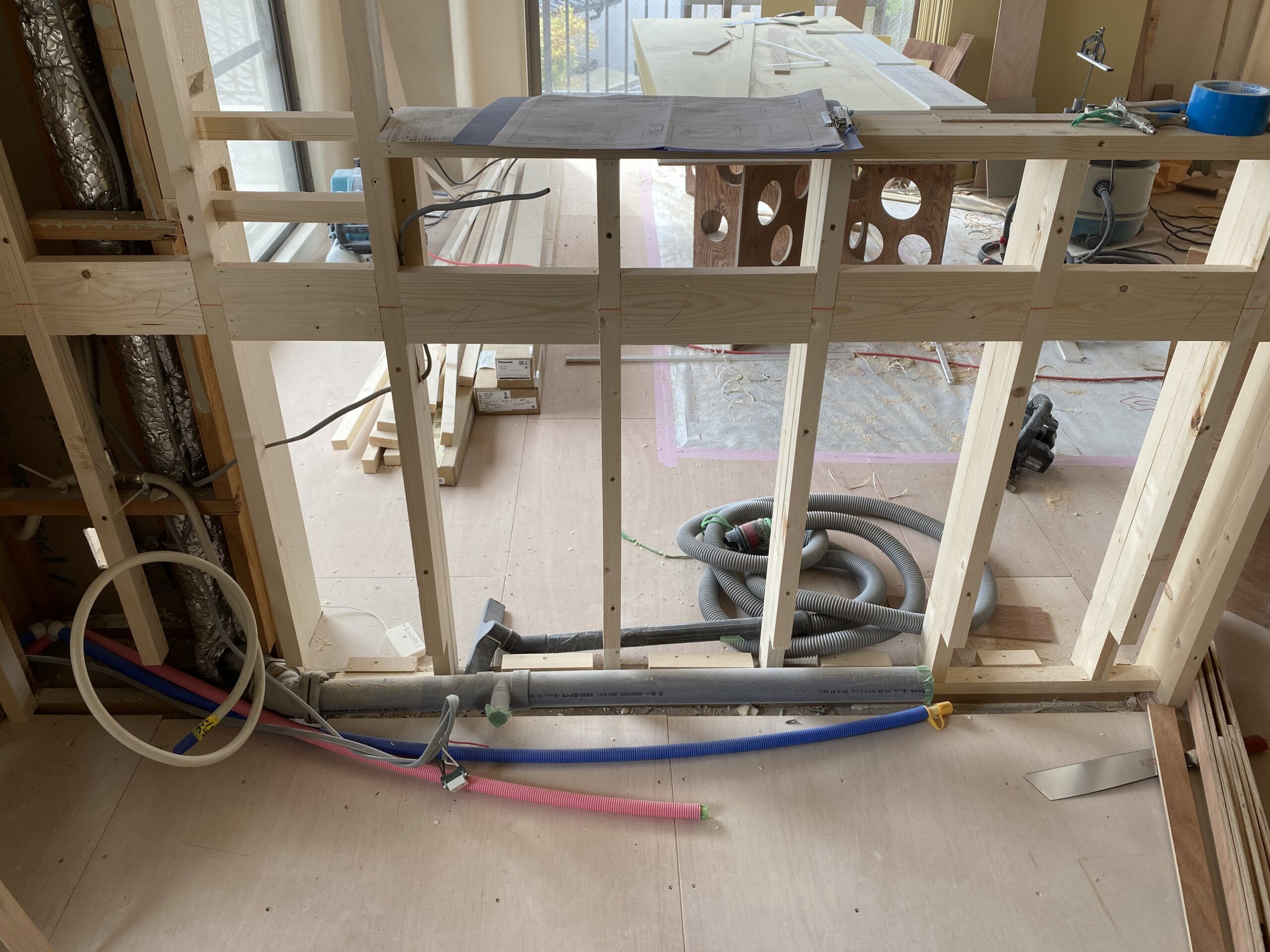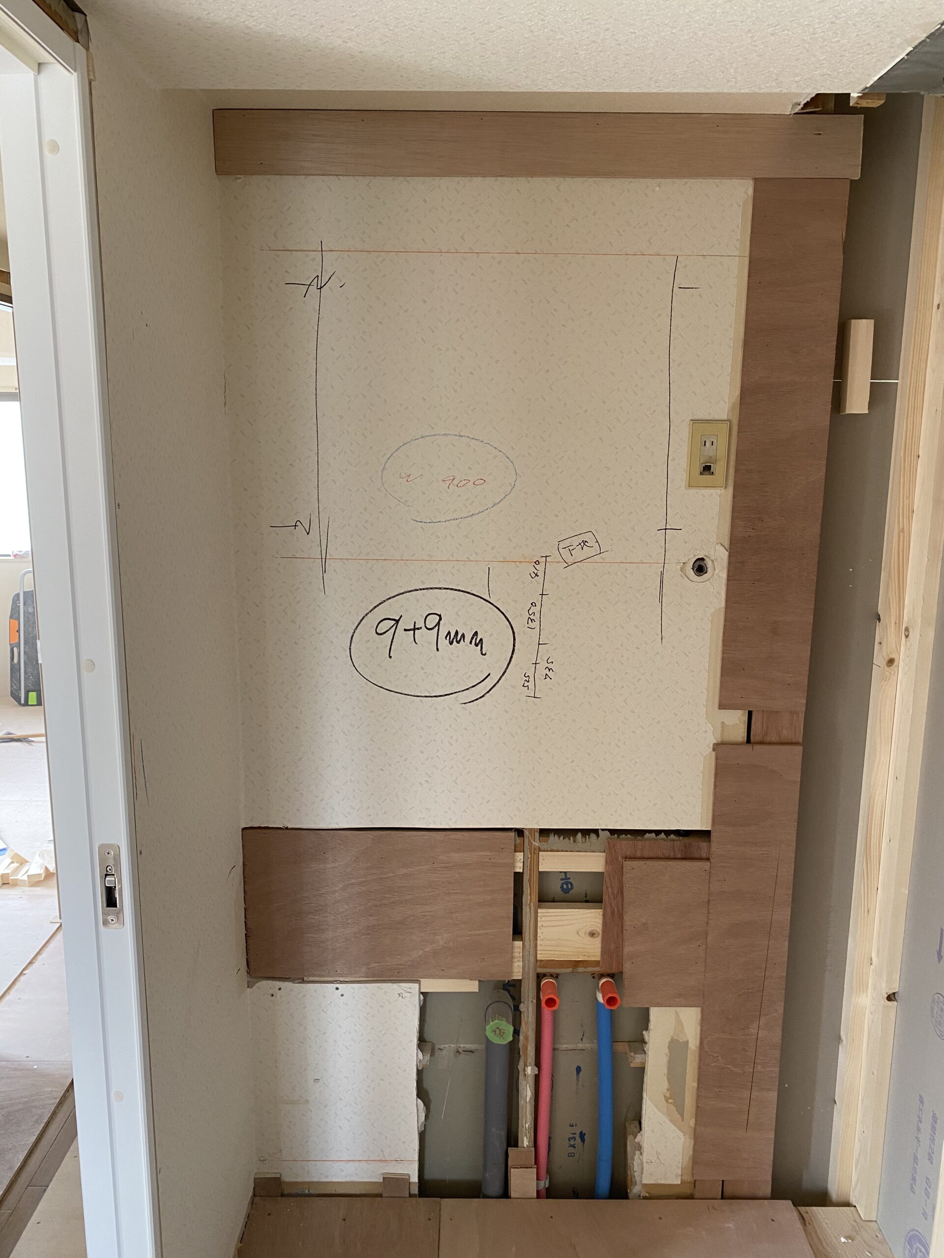 こちらもライオンズマンション明石二見。以前はこっちに洗濯機を置くスペースでした。それが今回は思い切って洗面台と洗濯機を置くスペースを逆に!!!洗面台が来るので給水、給湯、排水の管が3本!『ブルーグレーオーク』という名前からしてオシャレなカラーにしたので設置後が楽しみでしかないです。