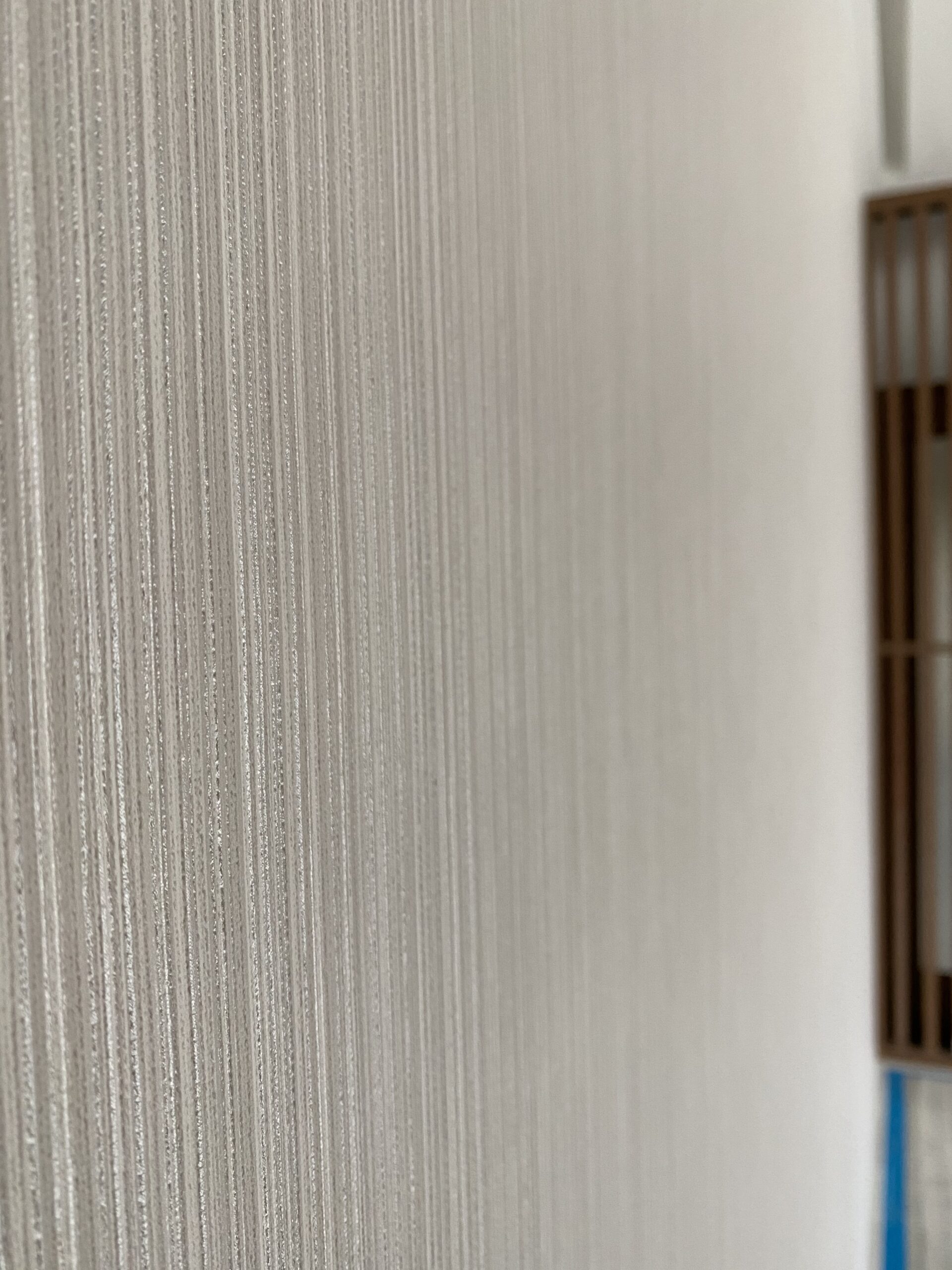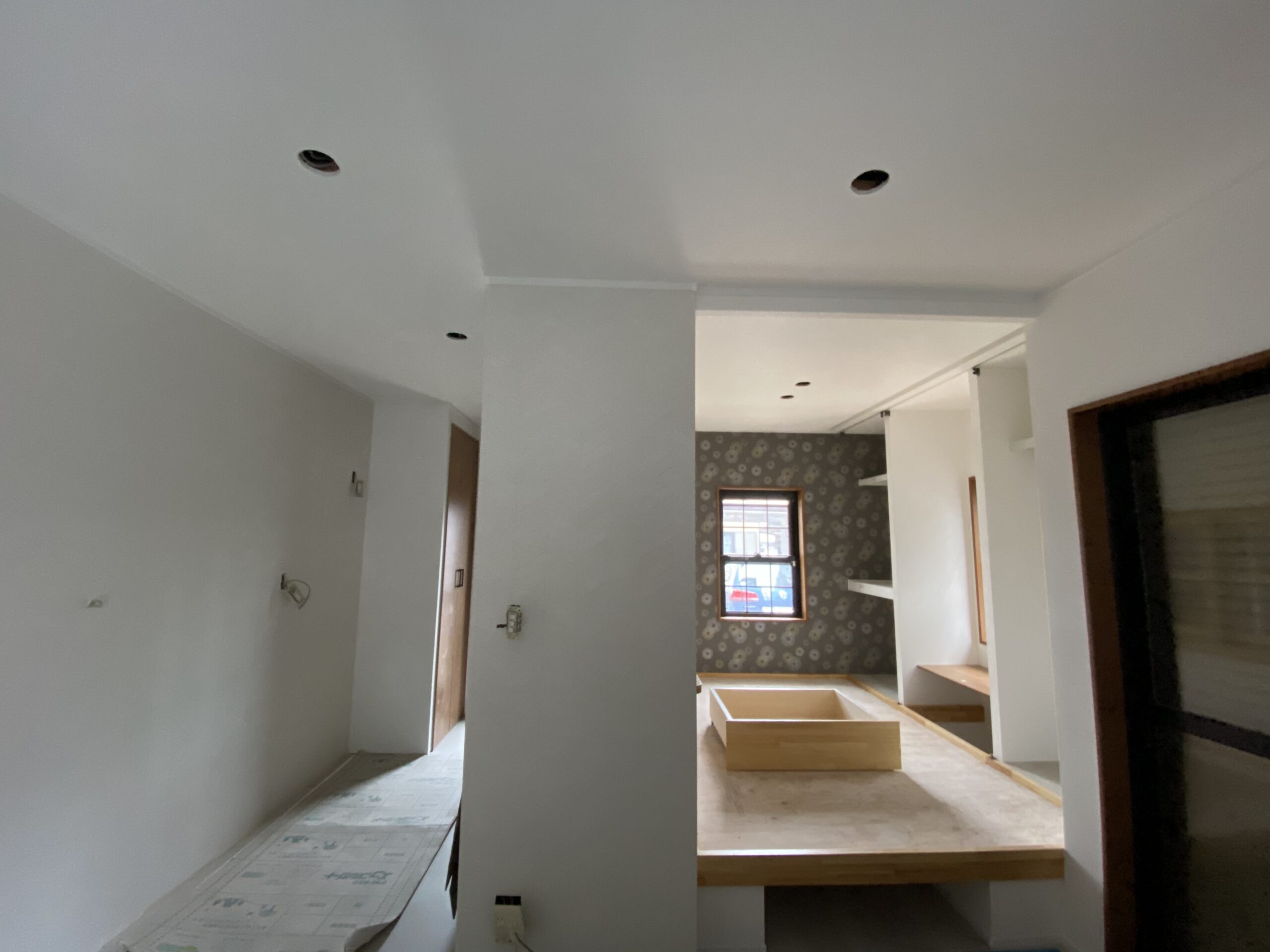 貴崎1丁目の中古戸建てのリフォーム物件。こちらご契約いただきました。ありがとうございます。日に当たるとキラキラお上品に光るクロス。お気に入りクロスがまた一つ増えました。遠くに見える木製の格子が映えています。そして天井にL字型で溝があるのが見えますでしょうか。こちらも照明埋め込みで間接照明になります!