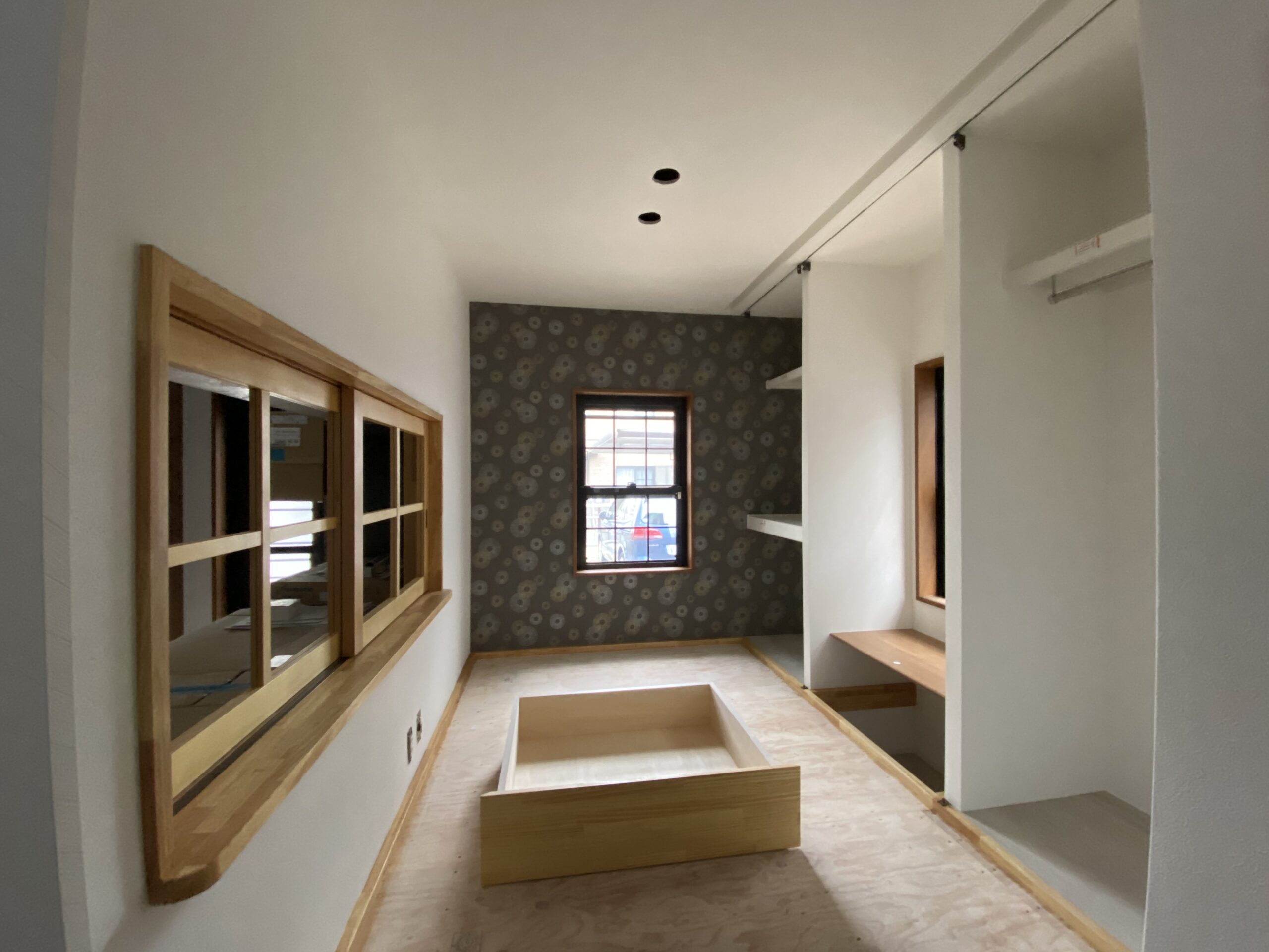 キッチン後ろのアクセントクロスは流行りの『ヘリンボーン』和室の奥には花火?お花柄??の可愛らしいクロスをドーーーンと!!!個人的にヘリンボーンがどんな感じになるのか想像できなかったので見たとき、いい感じ過ぎてテンション一気に上がりました。