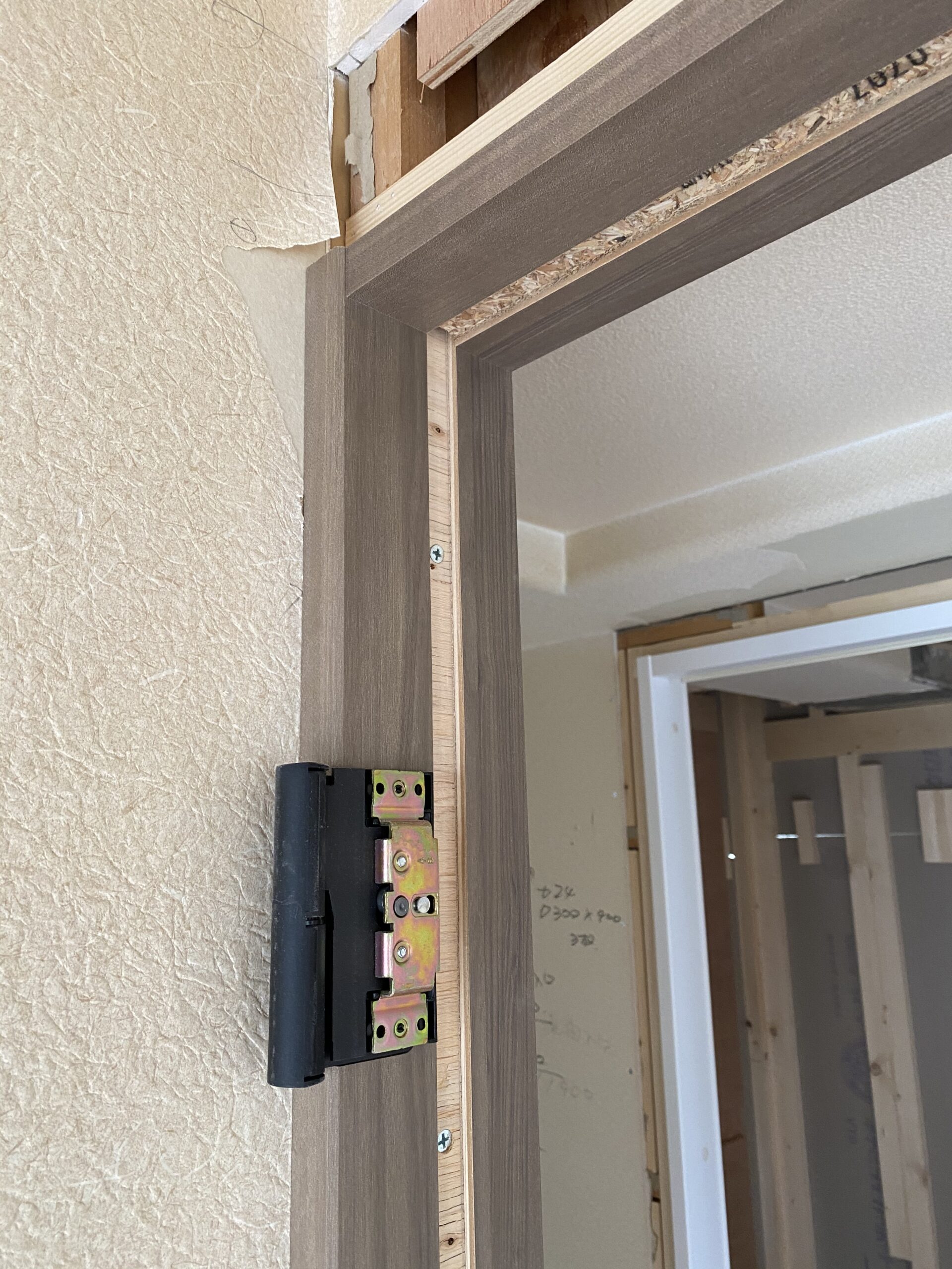 ライオンズマンション明石二見ラスト。室内ドアの枠だけ取り付けられていました。この色めちゃくちゃ可愛くないですか?!!!わたしイチオシの色で『グレージュウォールナット』この色だけはどうしても使いたくて社長にごり押しして取り入れていただきました😅Panasonicのショールームで実物見ながら話していて同席していただいていた建材屋さんの営業マンさん、となりで若干苦笑いしながら聞いておられました(笑)この他にもオシャレなものたくさん取り入れたリフォームになっております。
