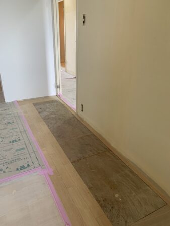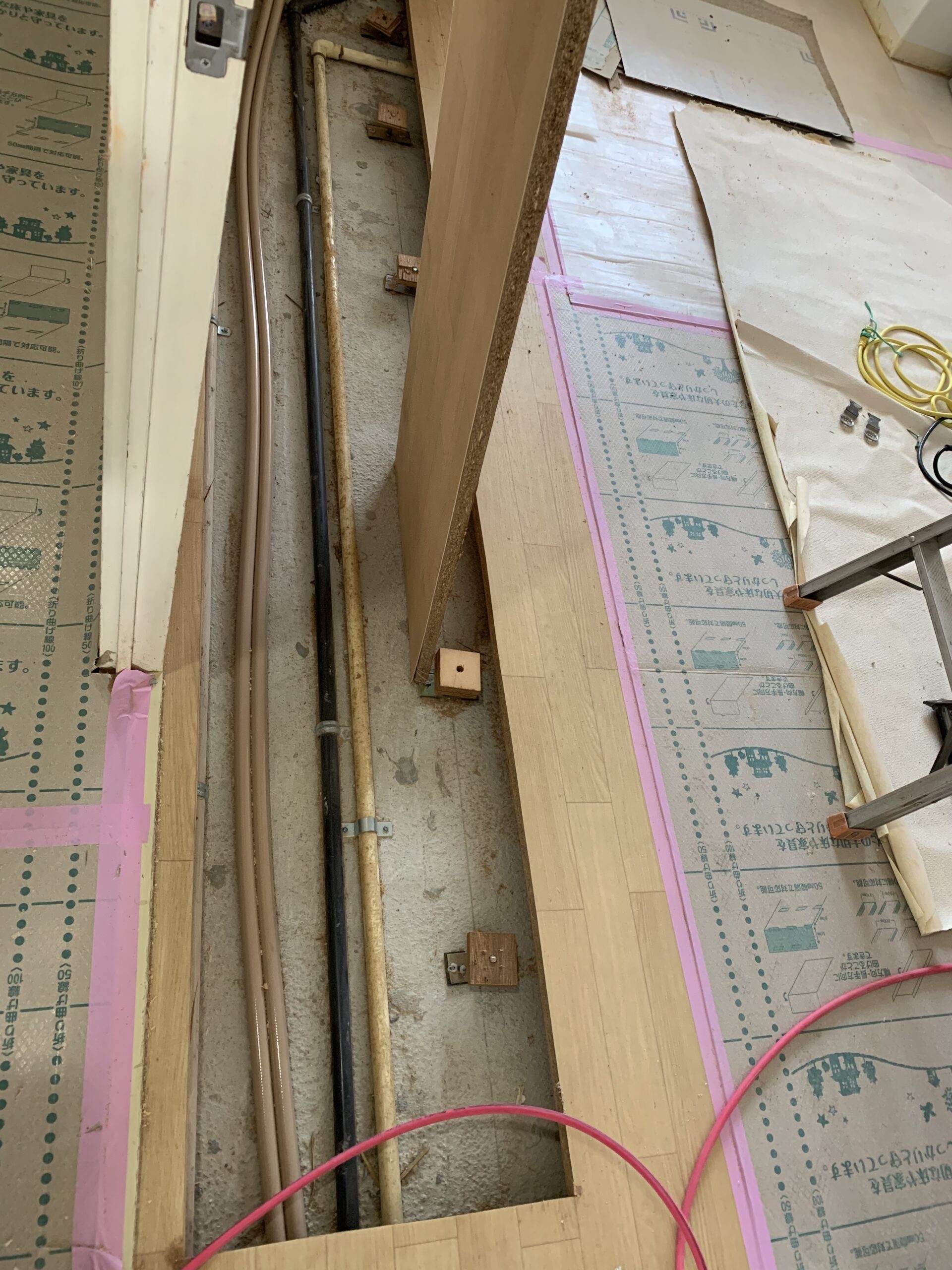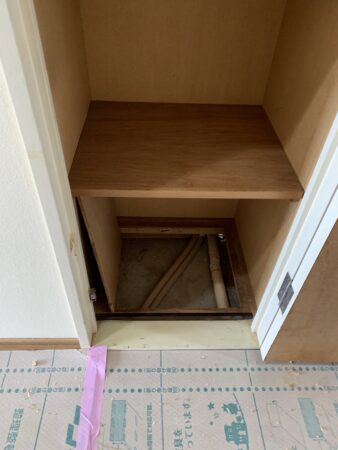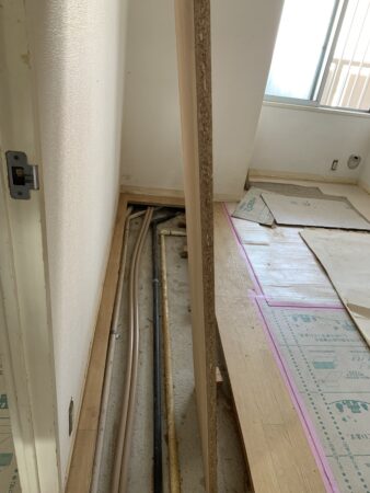 フローリングは綺麗だったので、水廻り以外の床の貼り替えは無しだったんですけど、追い焚きに変えることになりましたので、洋室のお部屋の下に配管が通っている為、床を剥がして張り替えることに。