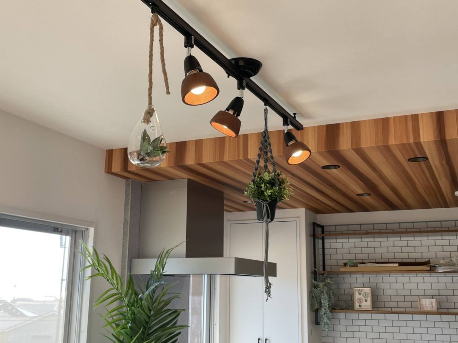 今回はカフェ仕様のお部屋。。。照明のレールにレール専用のフックをつけて観葉植物を吊り下げてみました♪