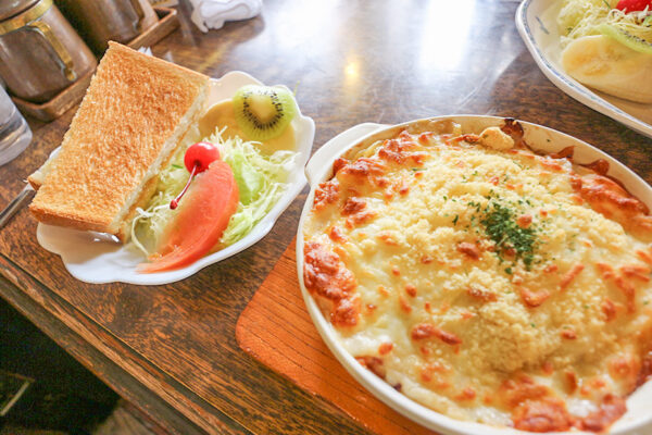それぞれトーストとサラダ、コーヒーか紅茶がセットになっています。