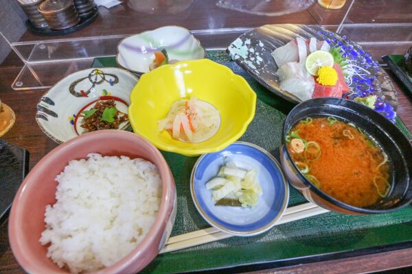 どちらも小鉢と魚のアラを使用した赤だし付き。