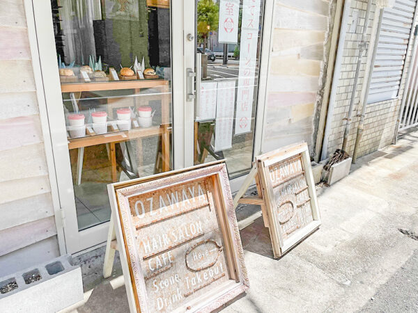 看板には、ヘアーサロン、カフェ、スコーンの文字!
