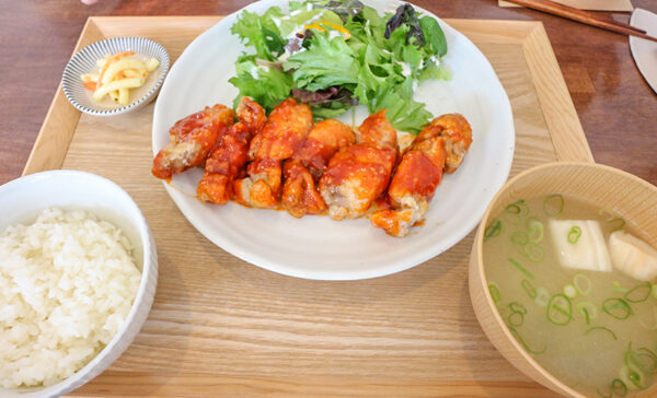 ヤンニョムチキンはピリ辛で