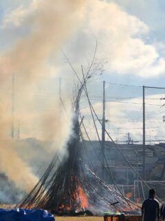 「とんど焼き」とは、1/15の小正月に正月飾りやお守りなどを燃やし、五穀豊穣、無病息災、家内安全を願う伝統行事で、