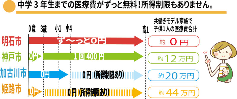 明石市では中学3年生までの医療費がずっと無料なんです!子供が病院に行ったときに払うお金は住んでいる場所によって違います。明石市は中学3年生まで親の収入に関係なく無料!所得制限がありません♪
