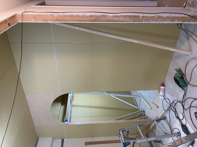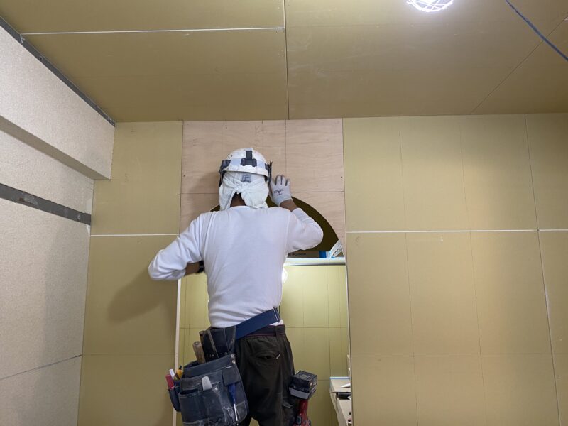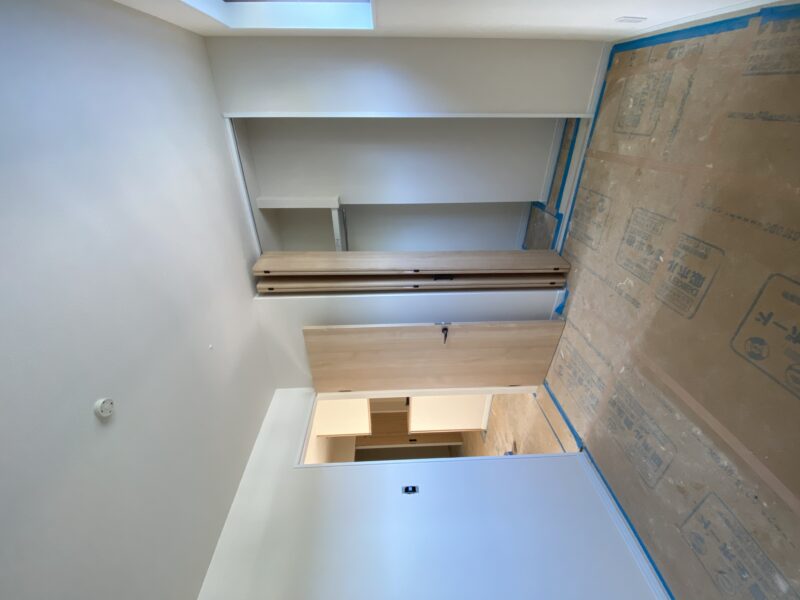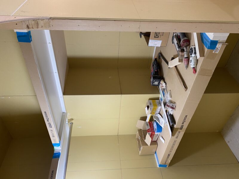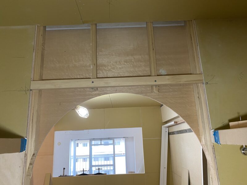 和室のオープンクローゼットの入口作成真っ只中でした!!!丸みを帯びた開口です。中の棚も設置されておりました。和室もう間もなく完成です。