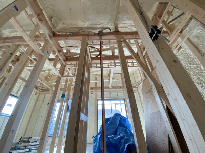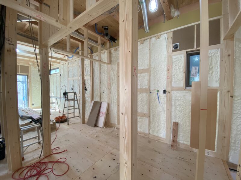 こちら、本日建材屋さんと大工さんとの打ち合わせがあるとのことで同行させていただきました。主に和室の出入り口のおさまりについてでした。打ち合わせ内容は難しくてわからないことだらけでした。今日現場で初めて目にしたもの。それはマシュマロのような断熱材😲断熱材といえば綿のようなものがナイロンで包まれてそれを柱と間柱の間にはめ込む、このようなものでした。初めてのものでなぜか謎のテンションで写真を撮りまくりました📷なんだこれ!と思うかもしれないですが、こういうものがあるんだな~という感じで見てもらえれば👇