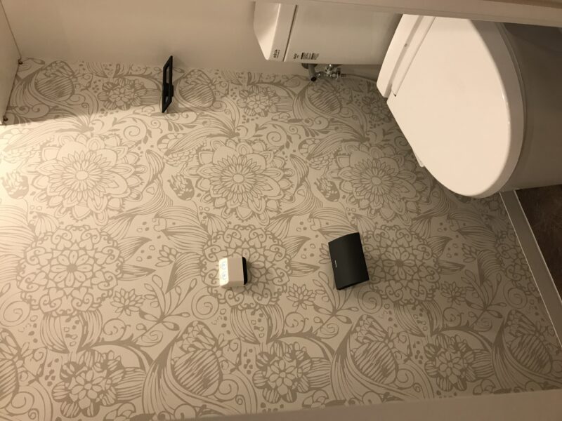 トイレのペーパーホルダー、タオルリングまで、Panasonic製を使っています!華やかなクロスに、黒で格好いいですよね!!