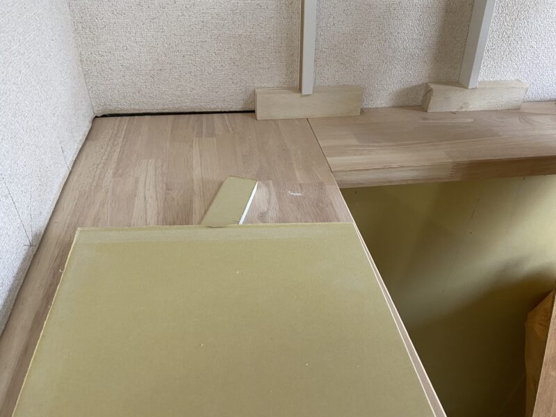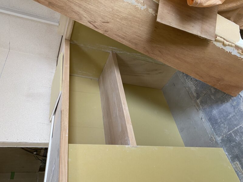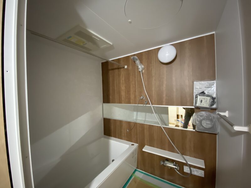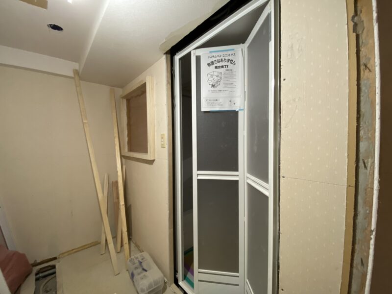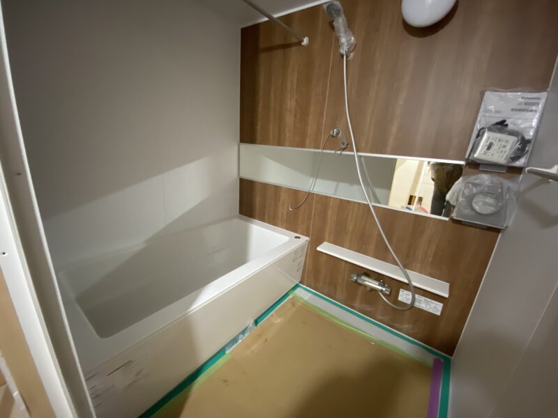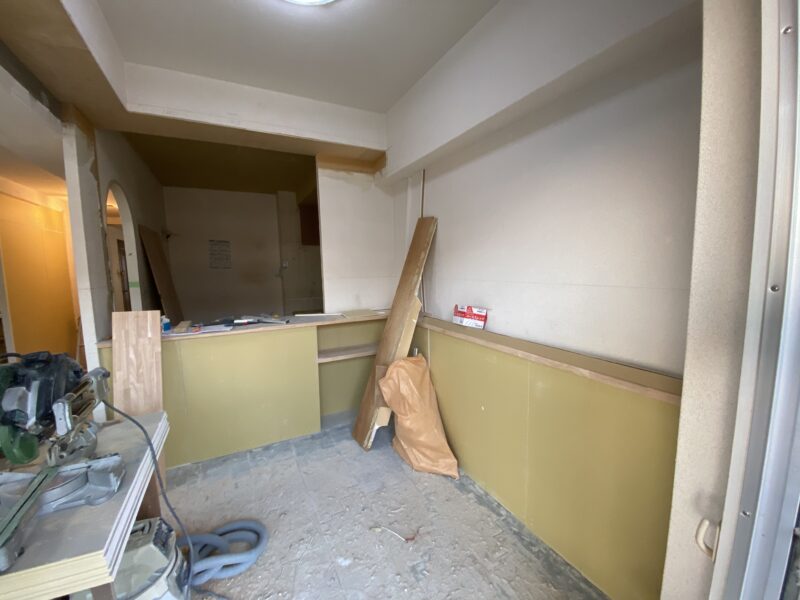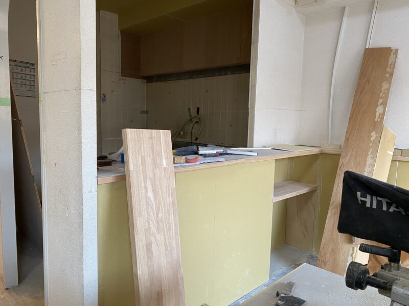 キッチンカウンターと浴室が完成しました!なんとカウンターはL字型です!!!現場では廊下にある棚を作成しておりました。高さ設定をさせていただいたので完成が楽しみでありドキドキです💦夕方ベランダから外を見ると景色が綺麗でしたので👍