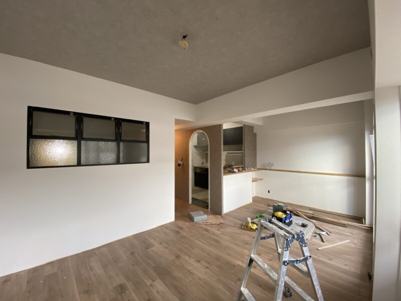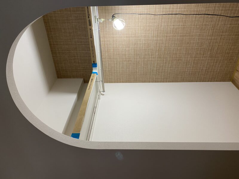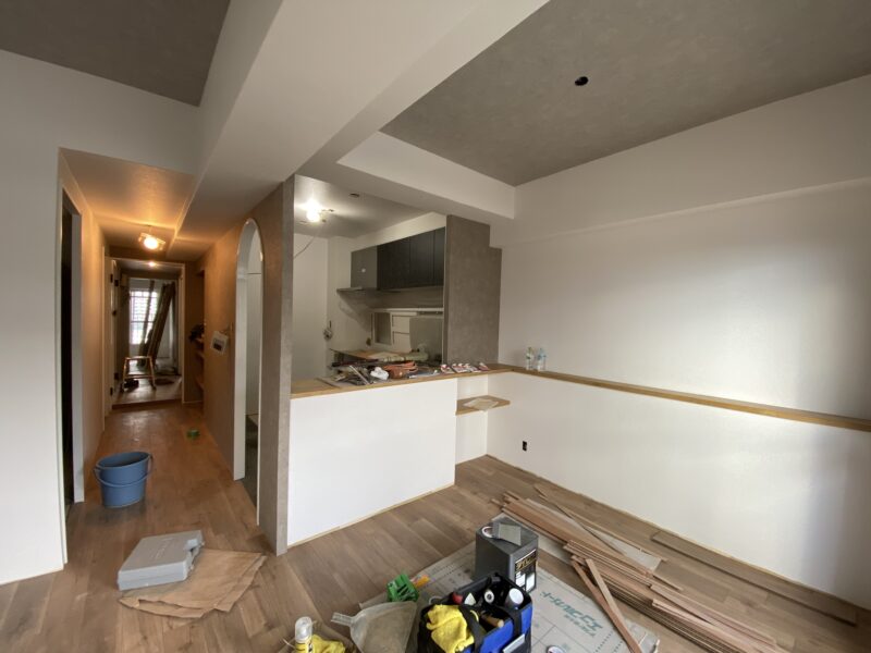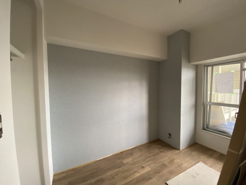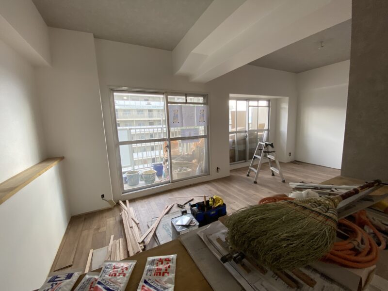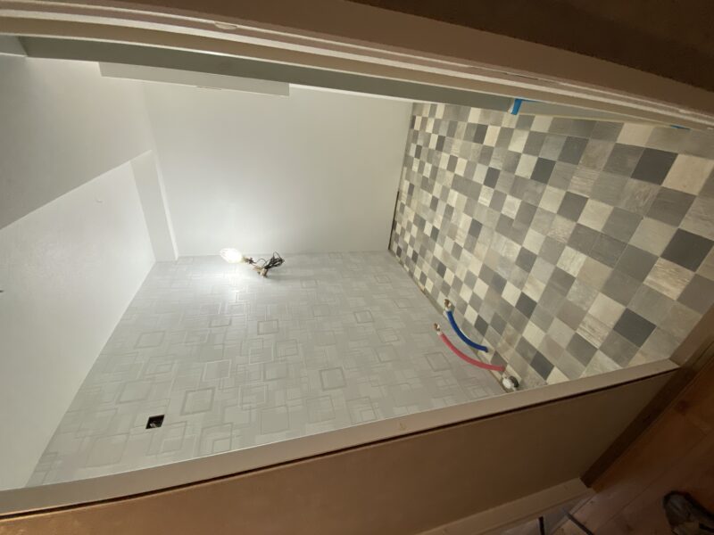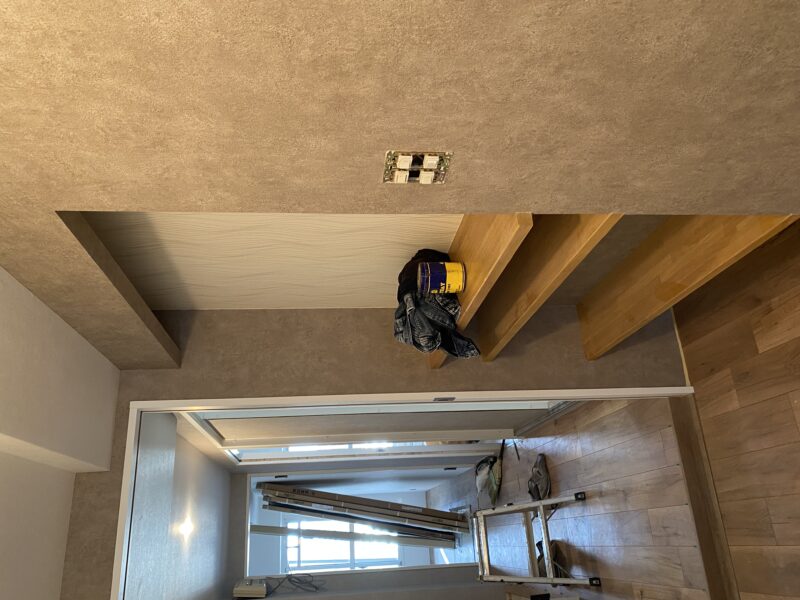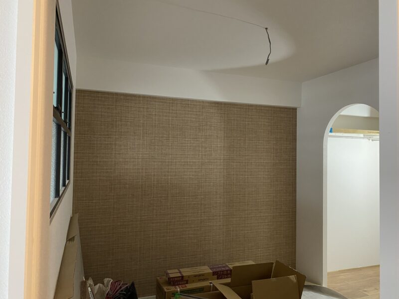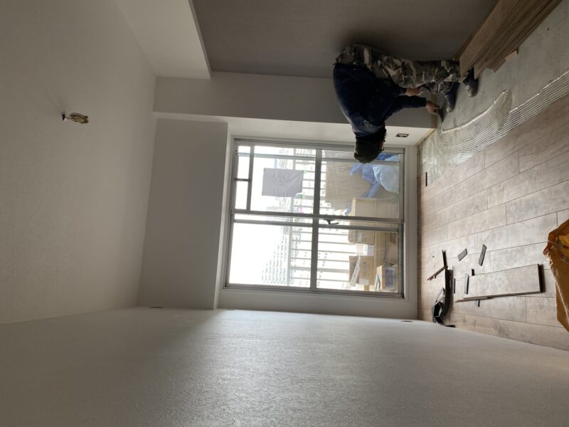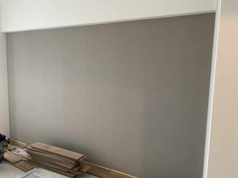 こちらクロス貼り終わって床材を貼っておられました!!!文章では伝わりきらないと思いますので写真をドドン!と掲載させていただきます。わたしのお気に入りクロスもしっかり貼ってあり、もうテンション劇上がりでした✨