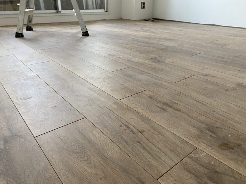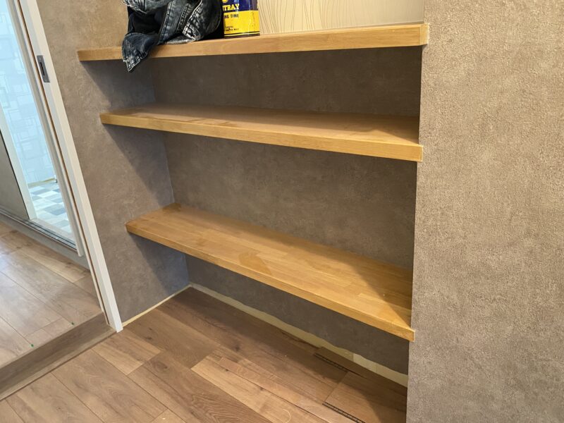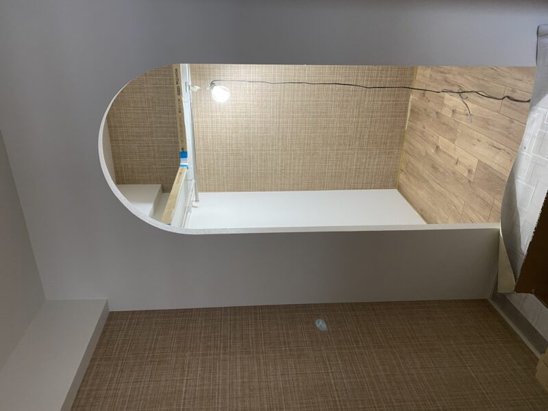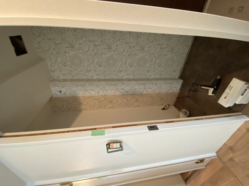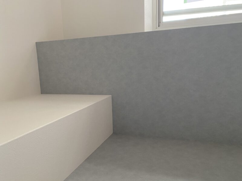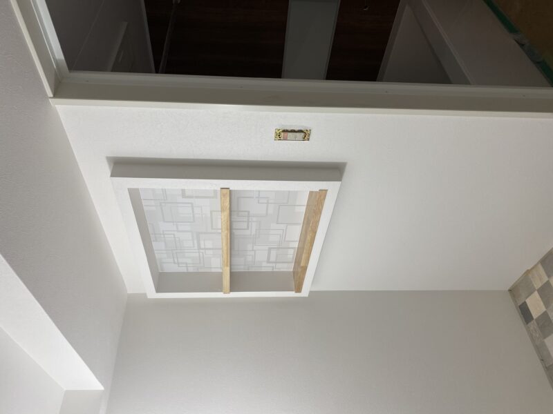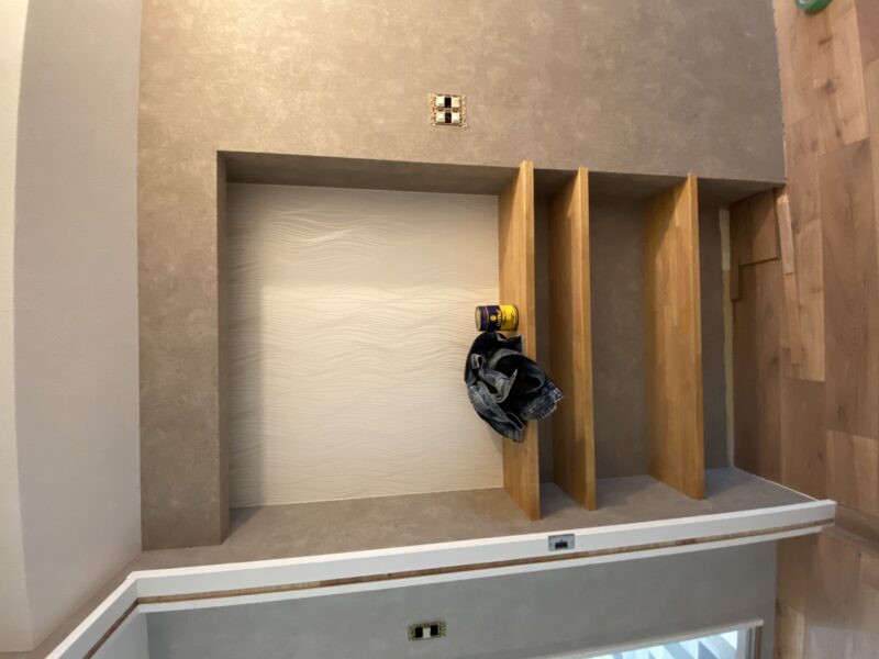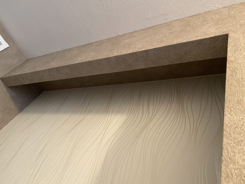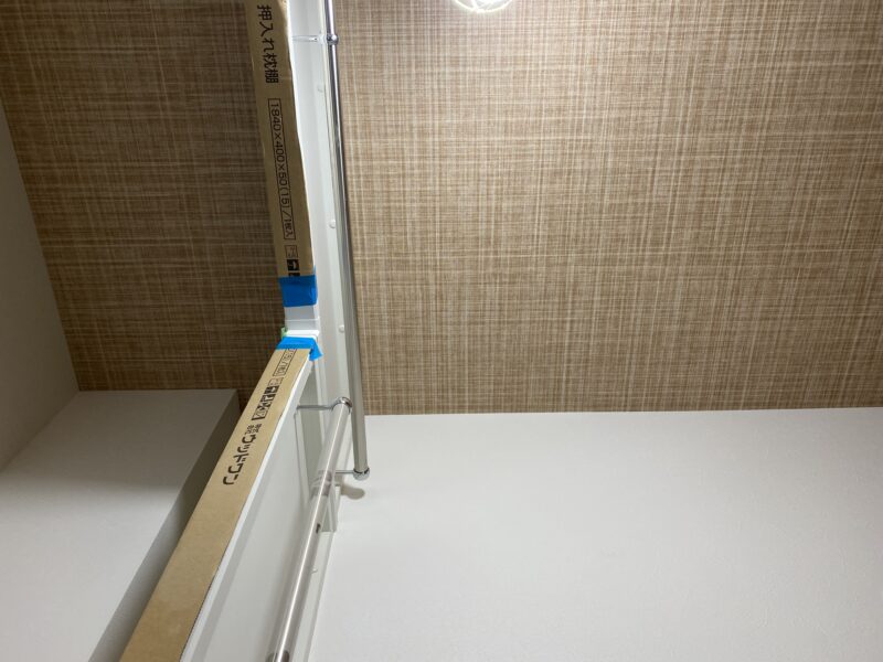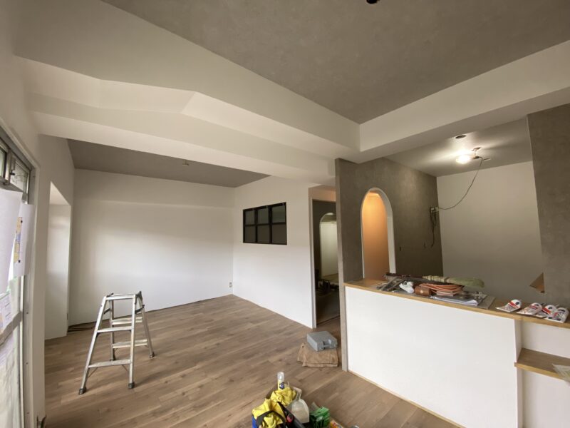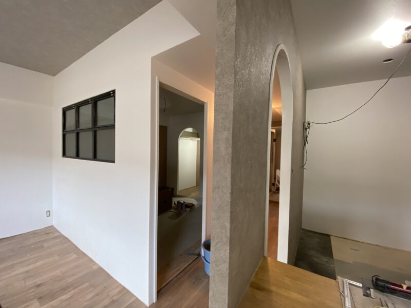 こちらクロス貼り終わって床材を貼っておられました!!!文章では伝わりきらないと思いますので写真をドドン!と掲載させていただきます。わたしのお気に入りクロスもしっかり貼ってあり、もうテンション劇上がりでした✨