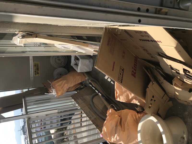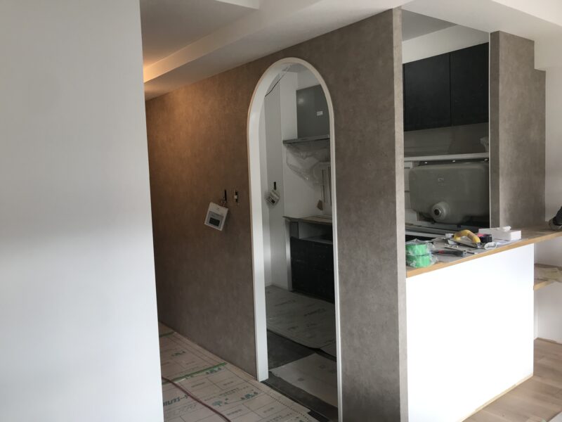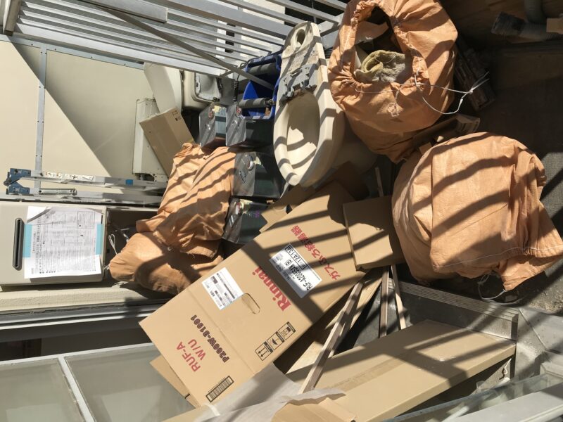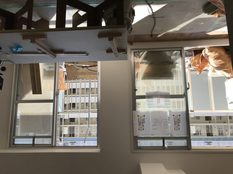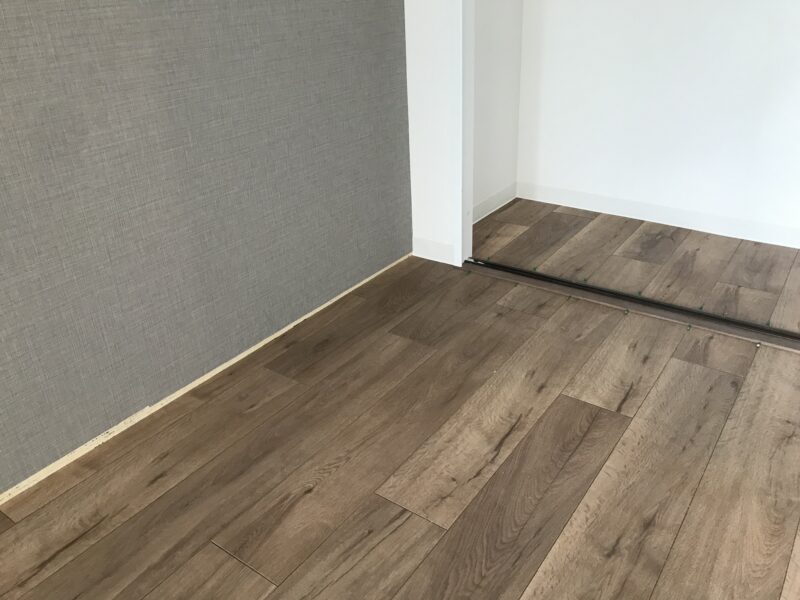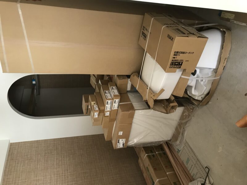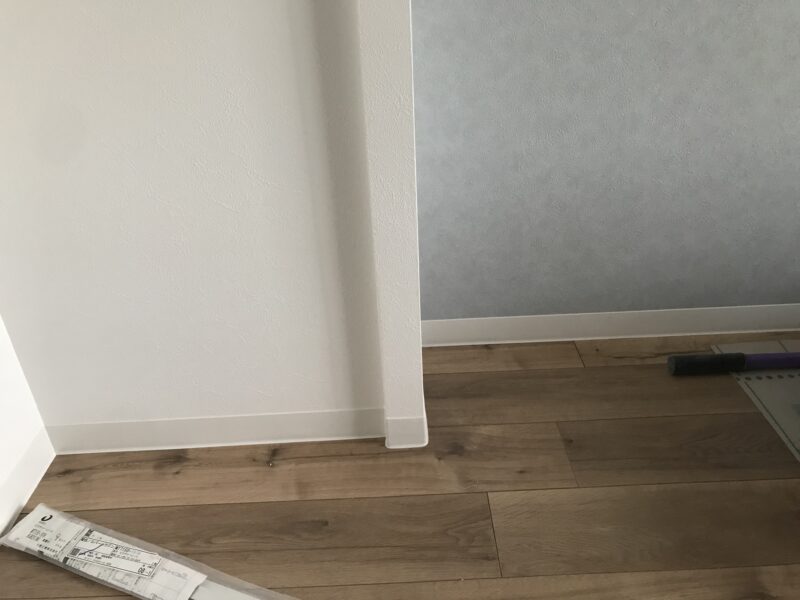こちらクロス、床材貼り付け完了しており、幅木という床材とクロスの境目に取り付ける部材を施工している最中でした。今日はゴミの片づけや材料の移動など行いました。案外持ってみると体が小さいわたしでも一人で運搬できるものが多かったです。