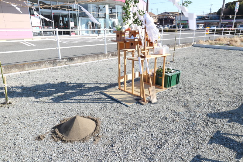 このキレイに整えられた盛砂は、「地鎮(じちん)の儀」の際、土地を象徴した盛砂に、施主様、施工業者が鍬(くわ)や鋤(すき)を入れます。