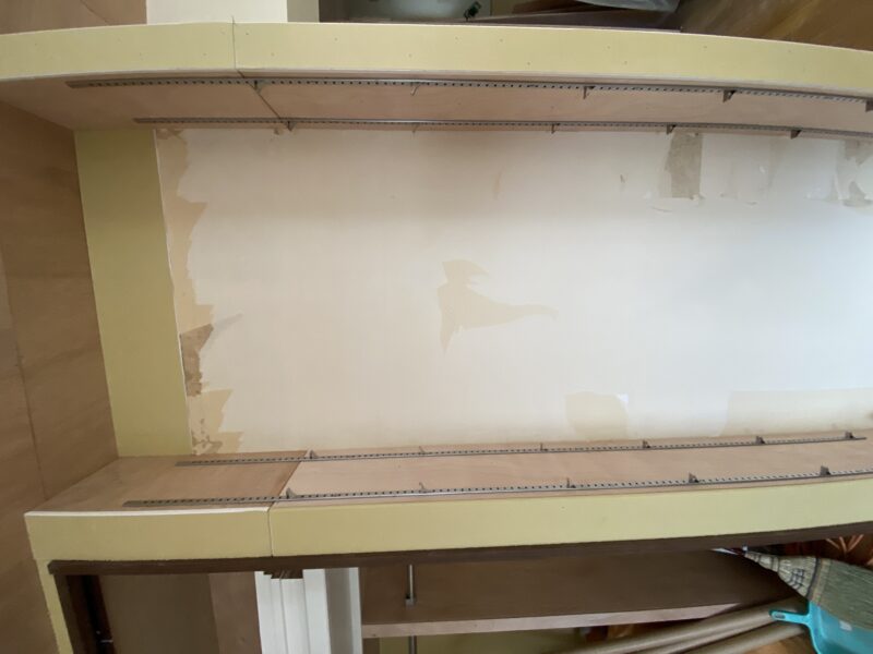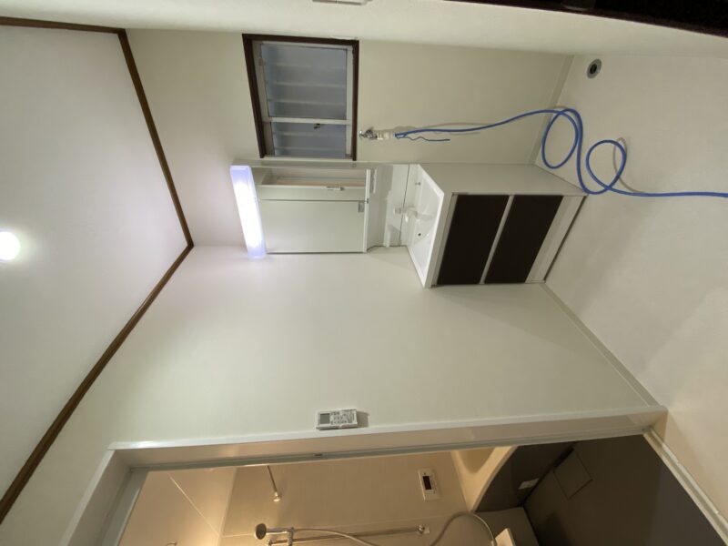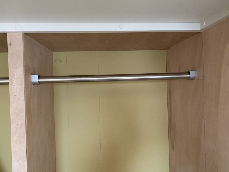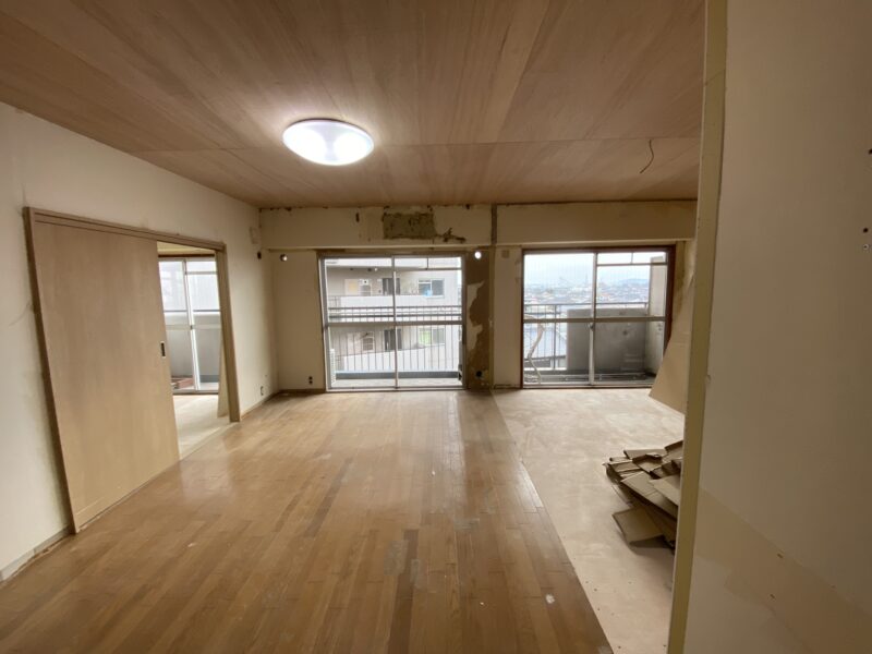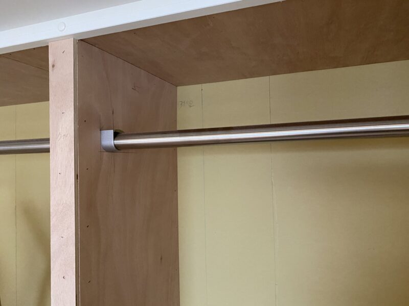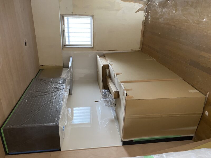 大工さん終盤。クローゼットのパイプハンガーの取付、本棚になる可動棚も完了しています。明日で大工さん完了予定です。大工さんが使用していた作業台がなくなるとこんなに広いんだ。と実感しました☺パイプハンガーの根本見てください!なんだかオシャレではありませんか?😲クロス屋さんにも入っていただき既存のめくり作業、下地作業を。キッチン搬入され取り付けも完了しておりました。明日はペンキ屋さんに入っていただき、塗装作業です。