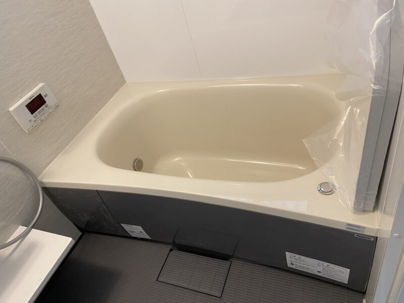 洗面台取り付け完了しました!クロスが白色なので洗面台のソフトウォールナット色が映えますね♩床のクッションフロアがラメが入ったキラキラなのですが電気をつけるとすごく綺麗です✨浴室の中もグレー調でオシャレです。今日からハウスクリーニング屋さんに入っていただいているので養生材を引き上げに行ってきました。