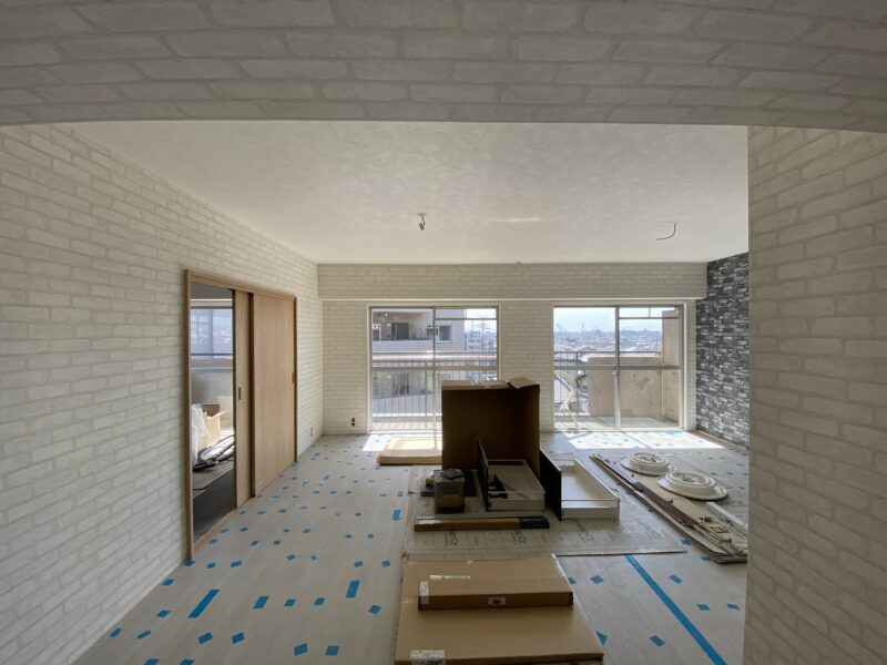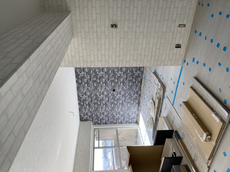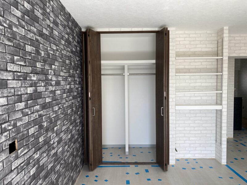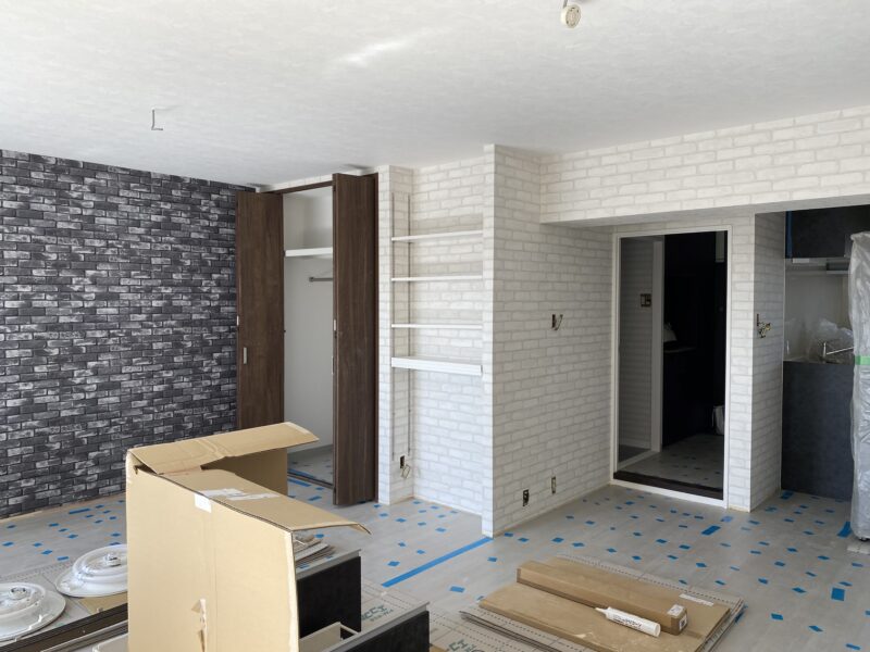 リビング一面ドドンとレンガ調です!ヴィンテージ感たっぷりでオシャレですよね😊洋室ふた部屋はデニム生地っぽいお部屋と(お客様とデニムの部屋と呼ばせていただいております)コンクリートの打ちっぱなしっぽいお部屋。トイレは下半分は木目調、上半分は星柄のものを⭐️クローゼットの色や下駄箱の色を配慮して一緒に決めさせていただきました!お客様から連絡がありまして、めっちゃいい感じですね!!!と嬉しいお言葉を😭