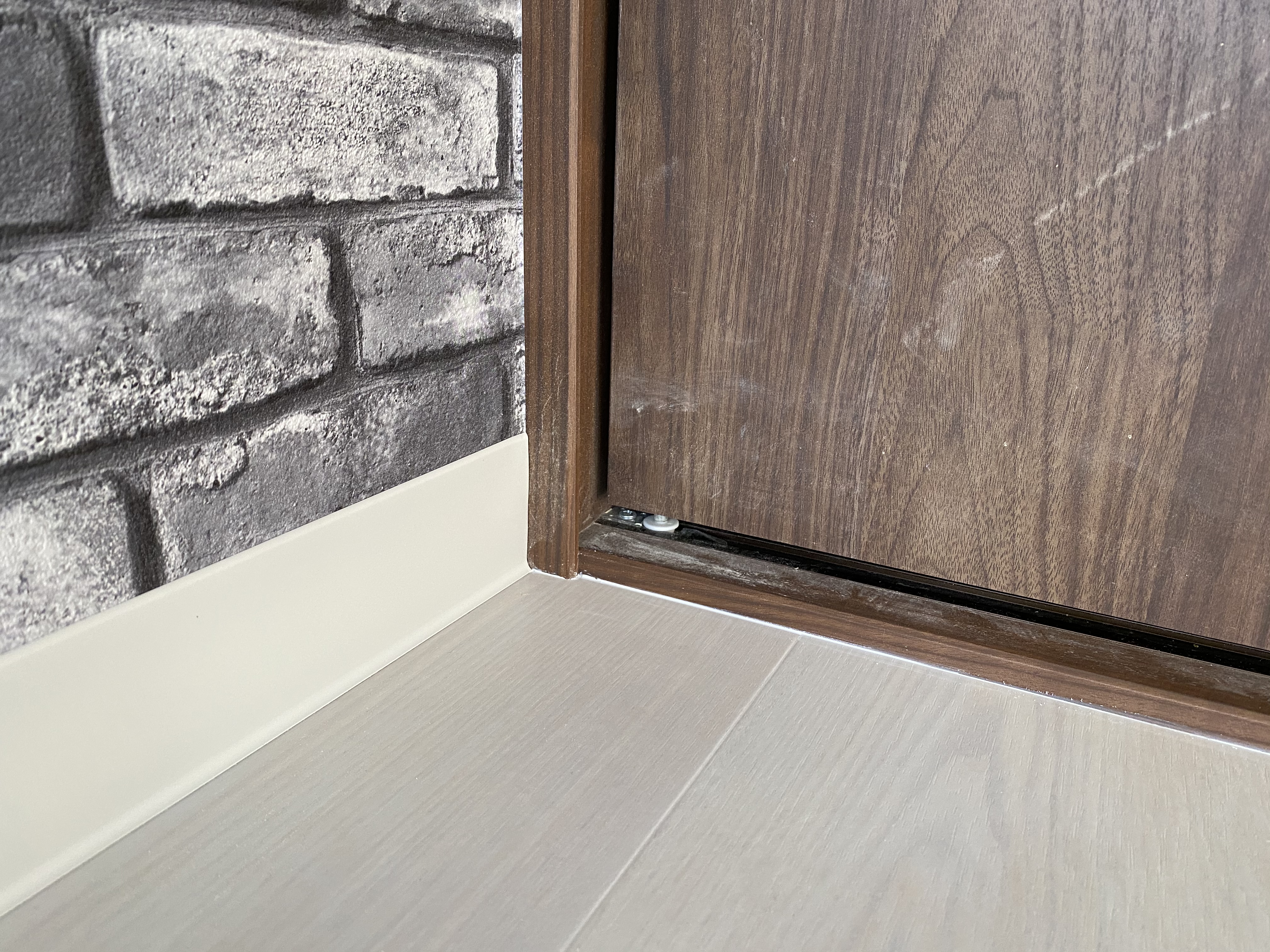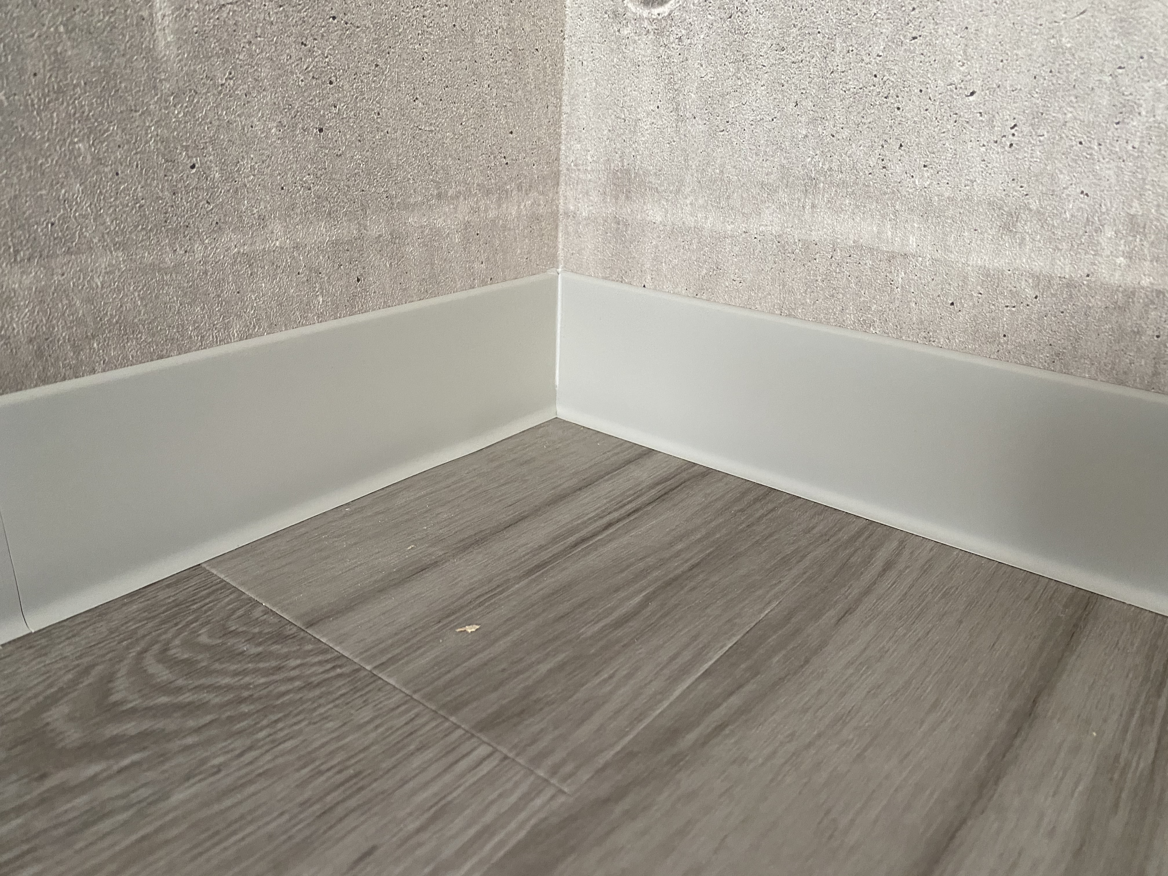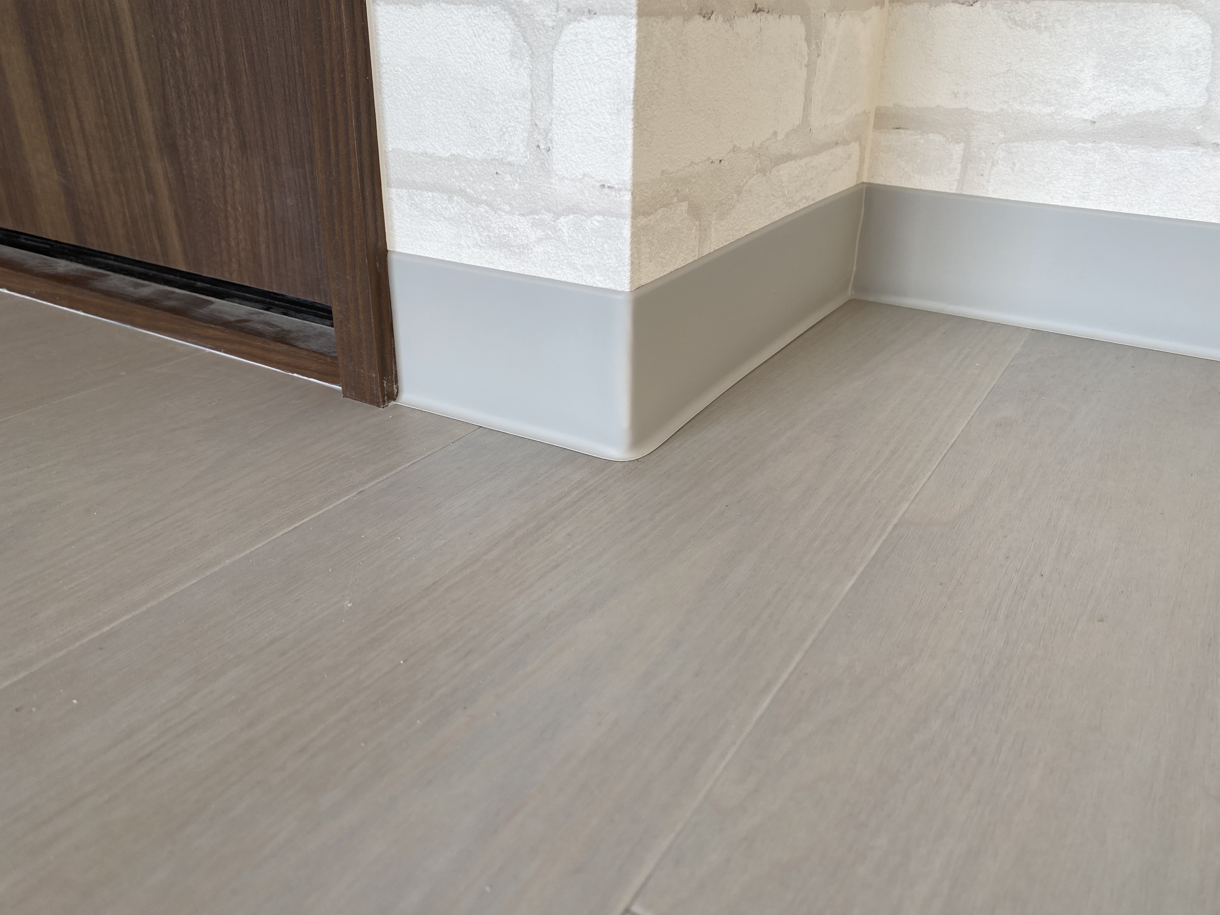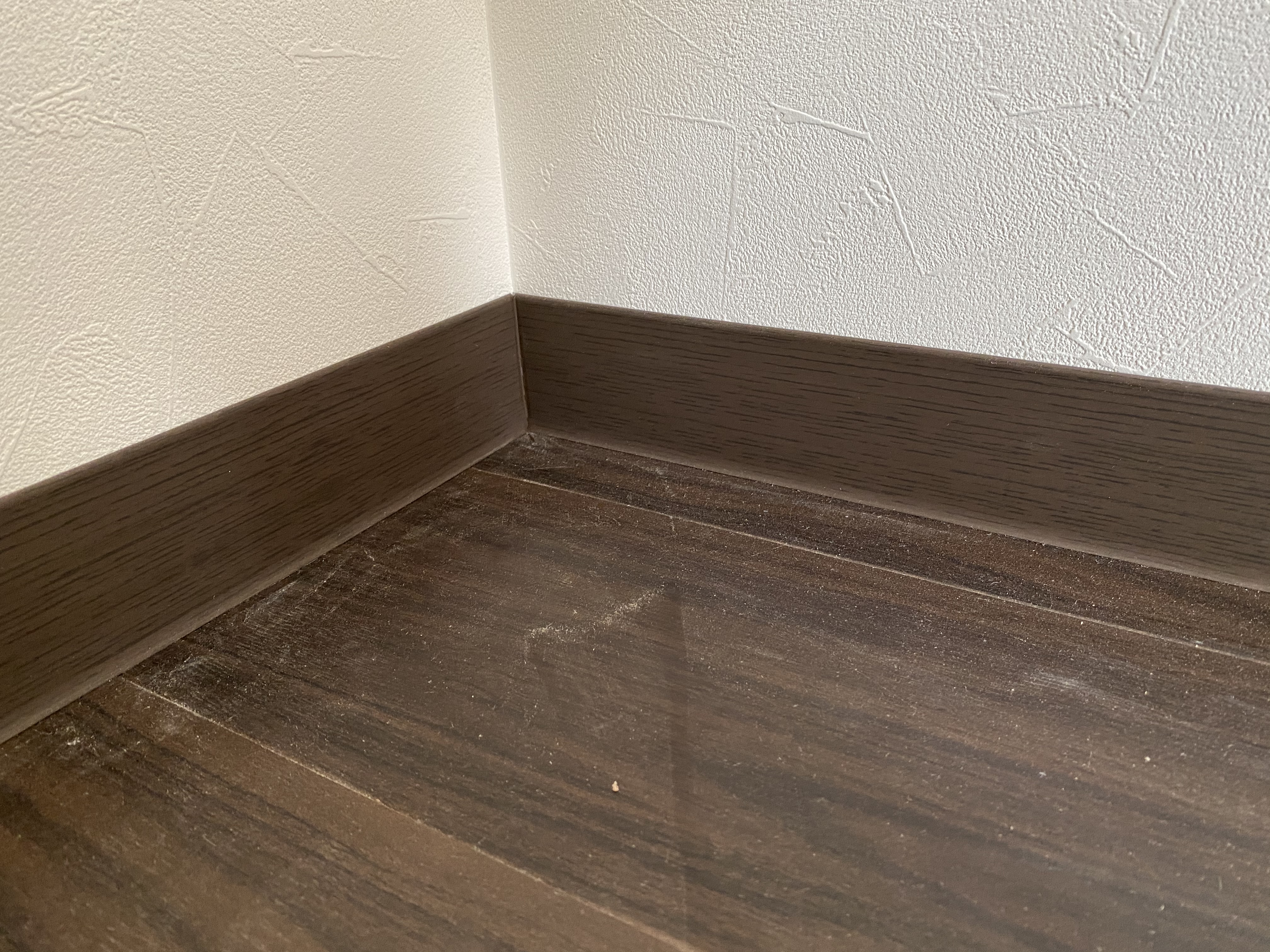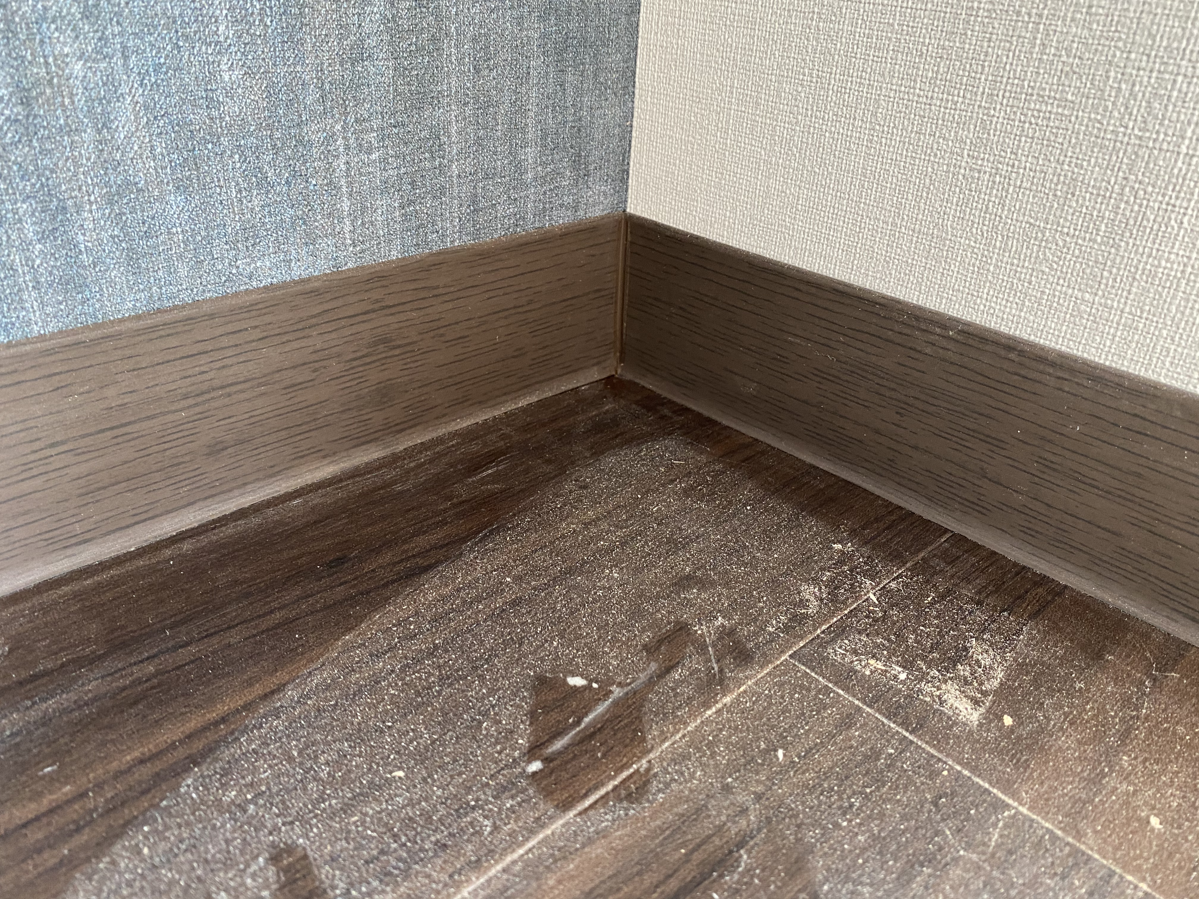 クロス、床工事完了間際!今回はクロスと巾木と呼ばれる床と壁の境目にある部材と床の写真を。こちら各部屋によって色を変えておられます。カラフルになるのかな。と発注する際ドキドキでしたが意外と落ち着いた雰囲気になっております。