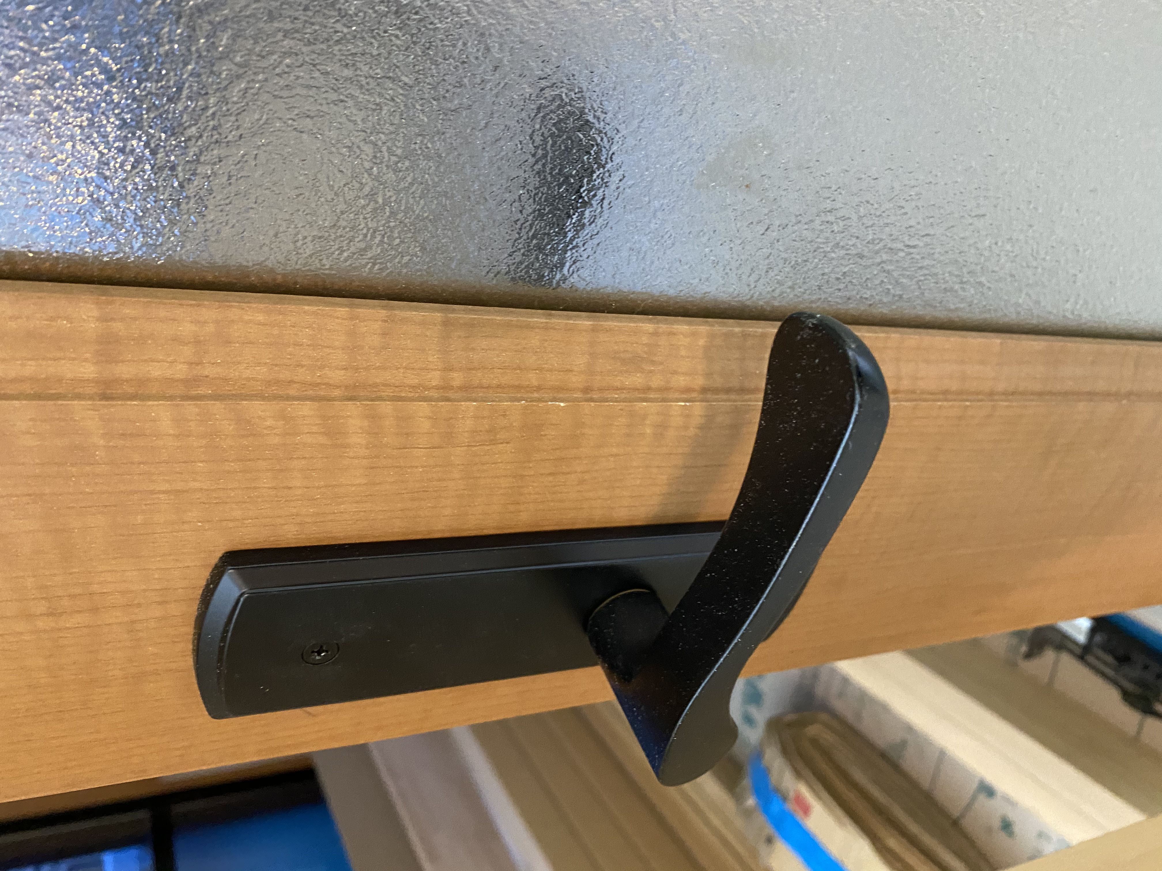 ドアノブが黒のマットのものに変身。そしてフローリングが仕上がっておりました。白基調のものに。少しずつ変身しております。