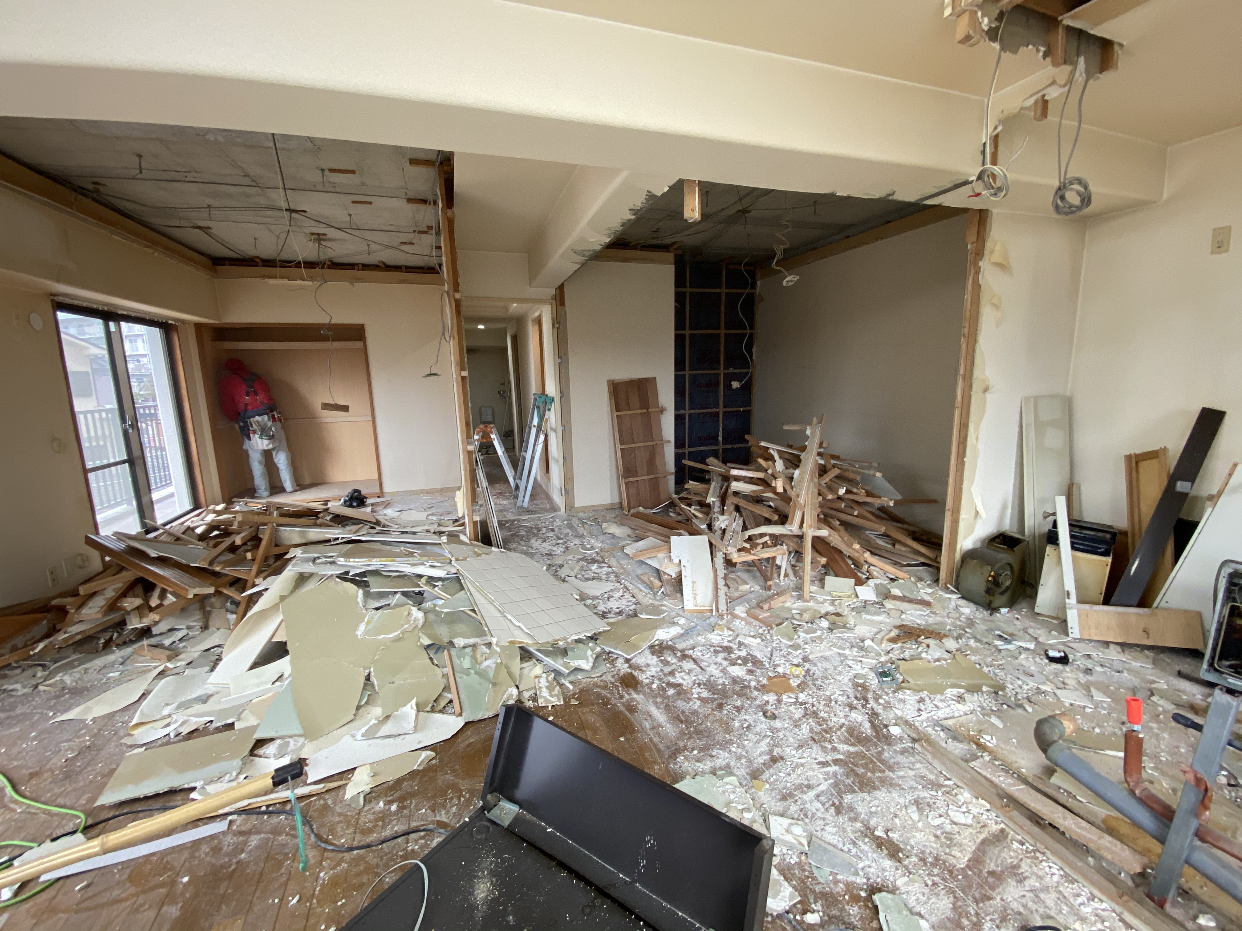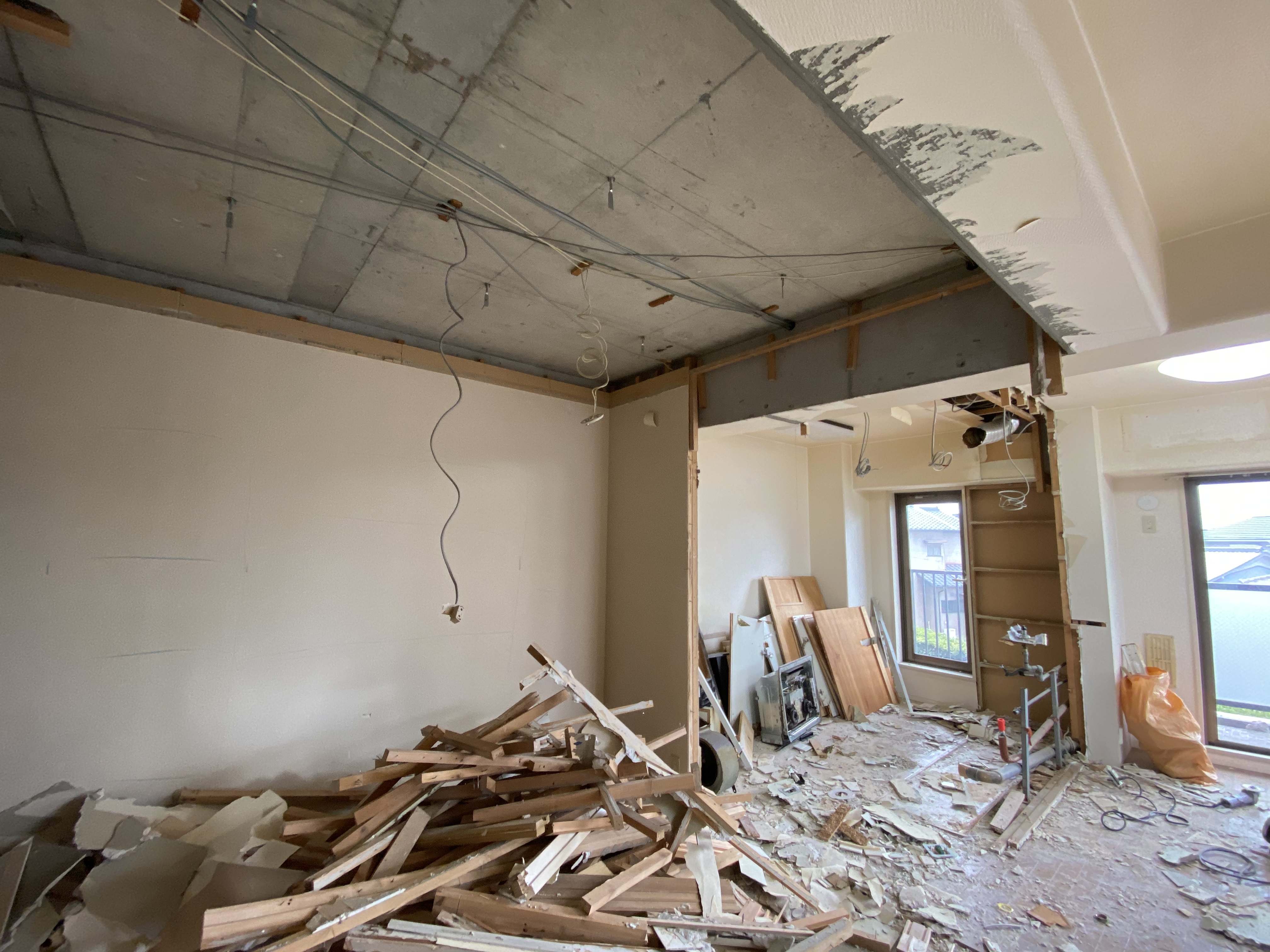 本日から工事スタートです。工事始まる日を『着工』といいます。本日、着工でした。15時頃に行くともうこのようになっておりました。すっからかんです。金曜日にゴミを回収しに来てもらうのでそれまでに大工さんに解体作業頑張っていただきます。