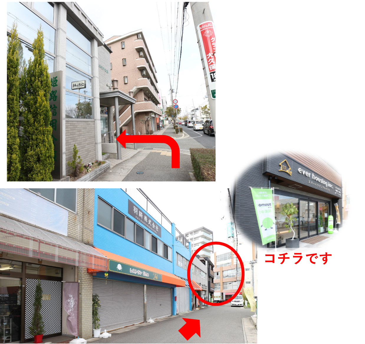 国道2号線「国道 大久保」交差点より、北進してお越しのお客様は姫路信用金庫の角を左折して直進してください。
