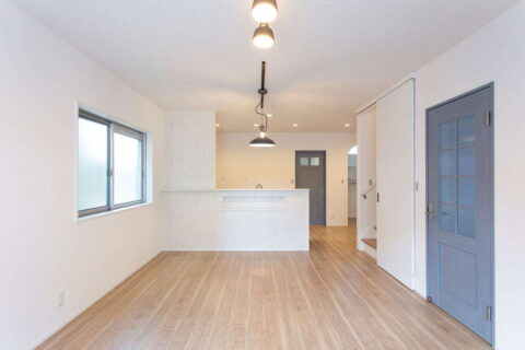 天井や壁、キッチンのクロスをホワイトで統一したことで、よりライトブルー…