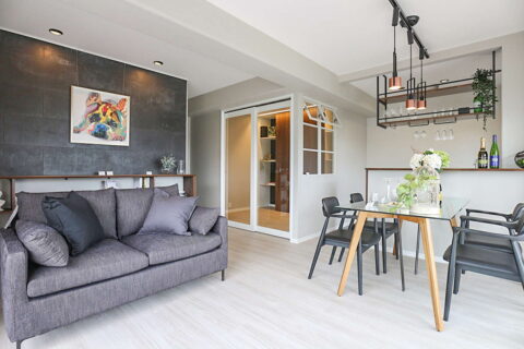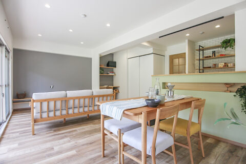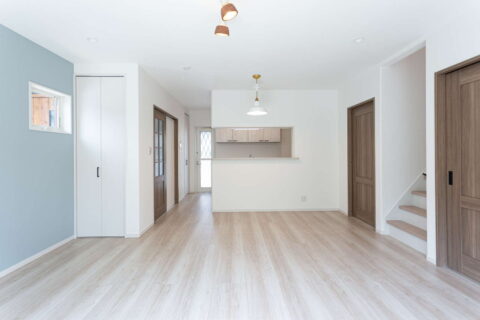 扉や床のクロスを木目で統一し、リビングのスポットライトにも木目。優しい…