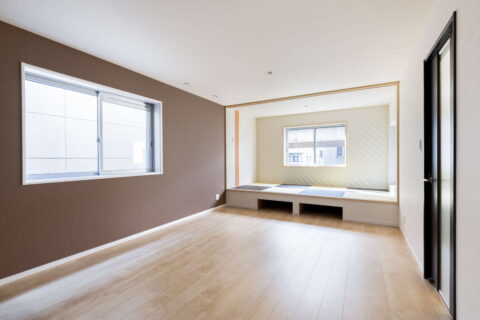 タタミスペースのモダンな柄が目を引くリビング。小上がり部分を収納スペー…