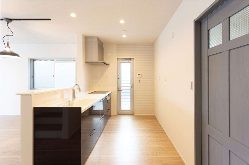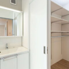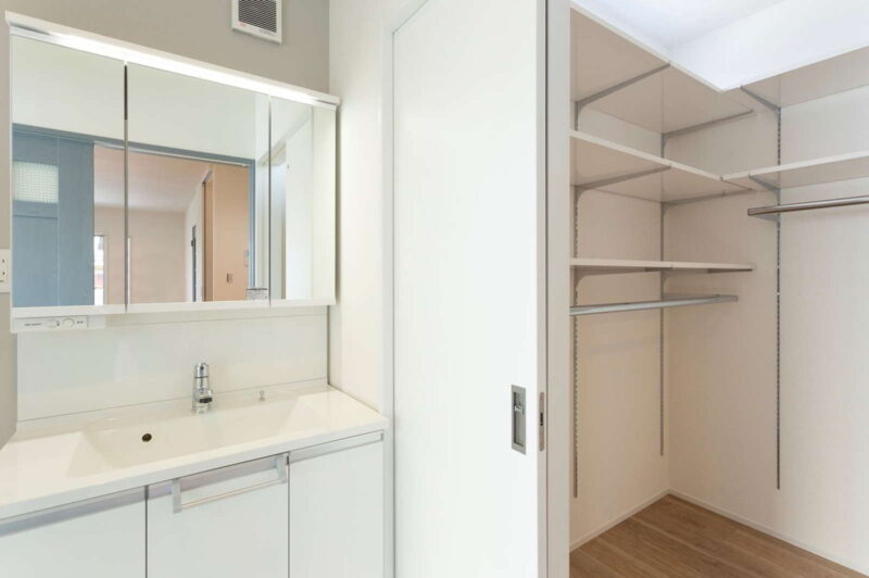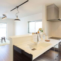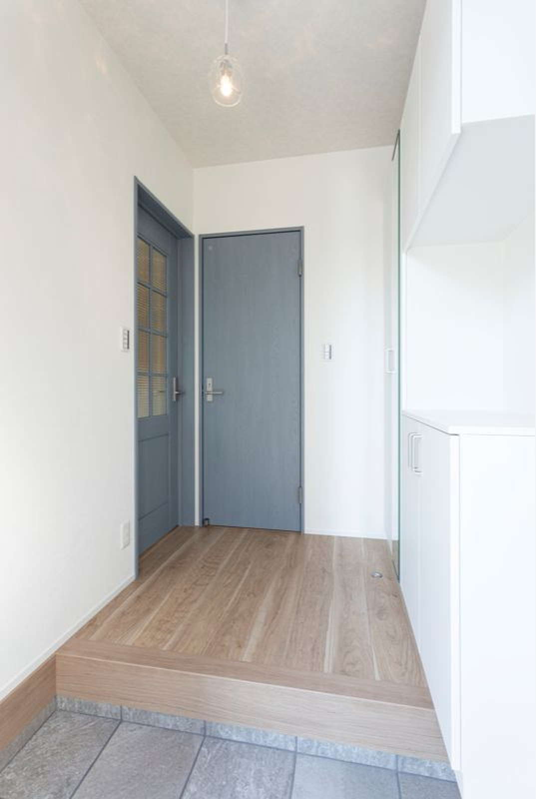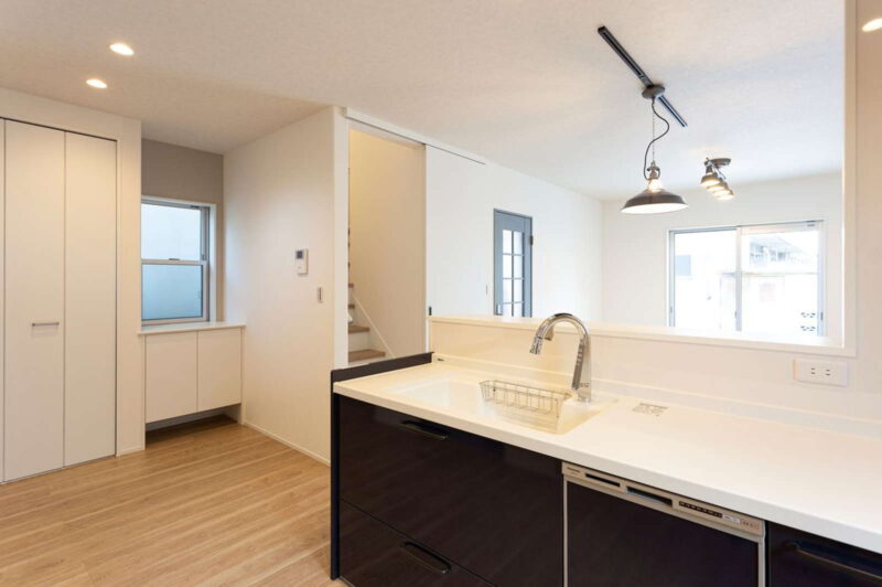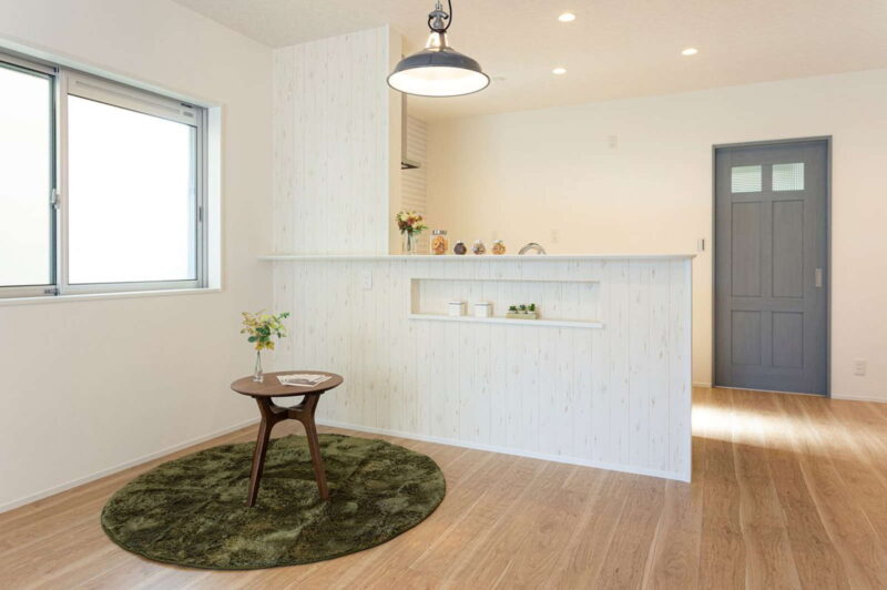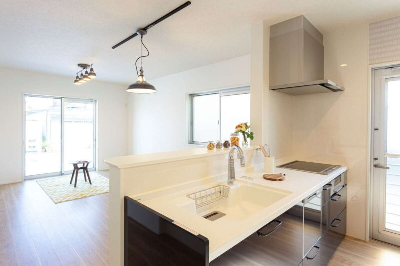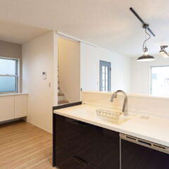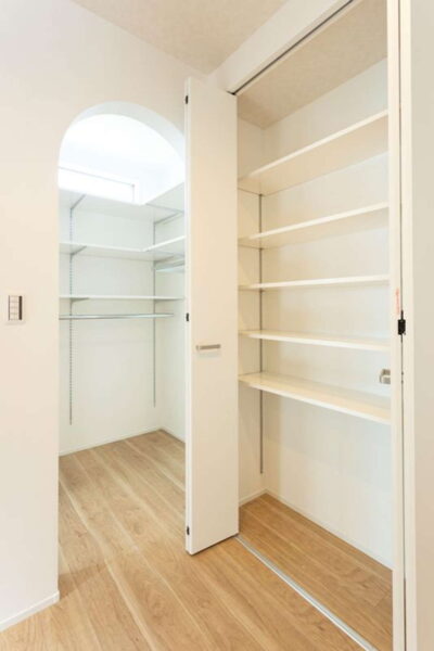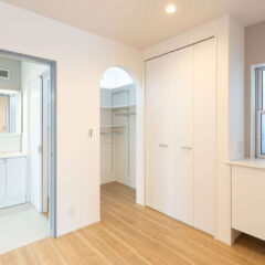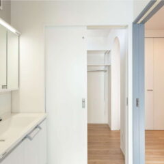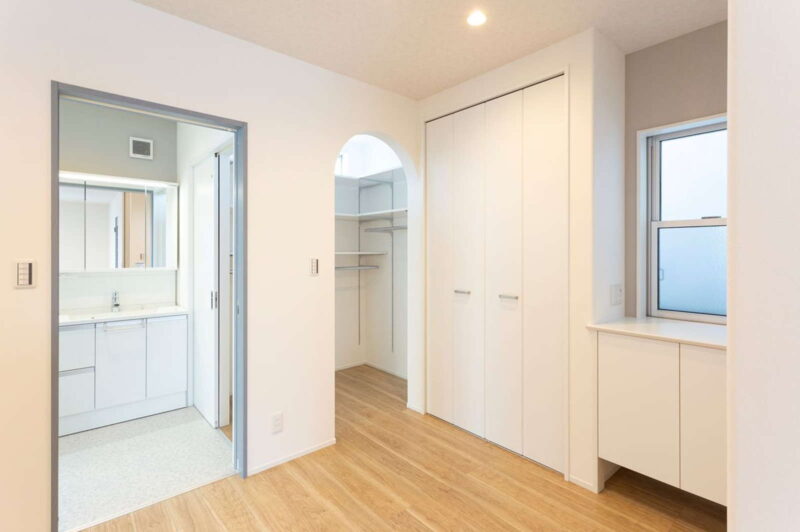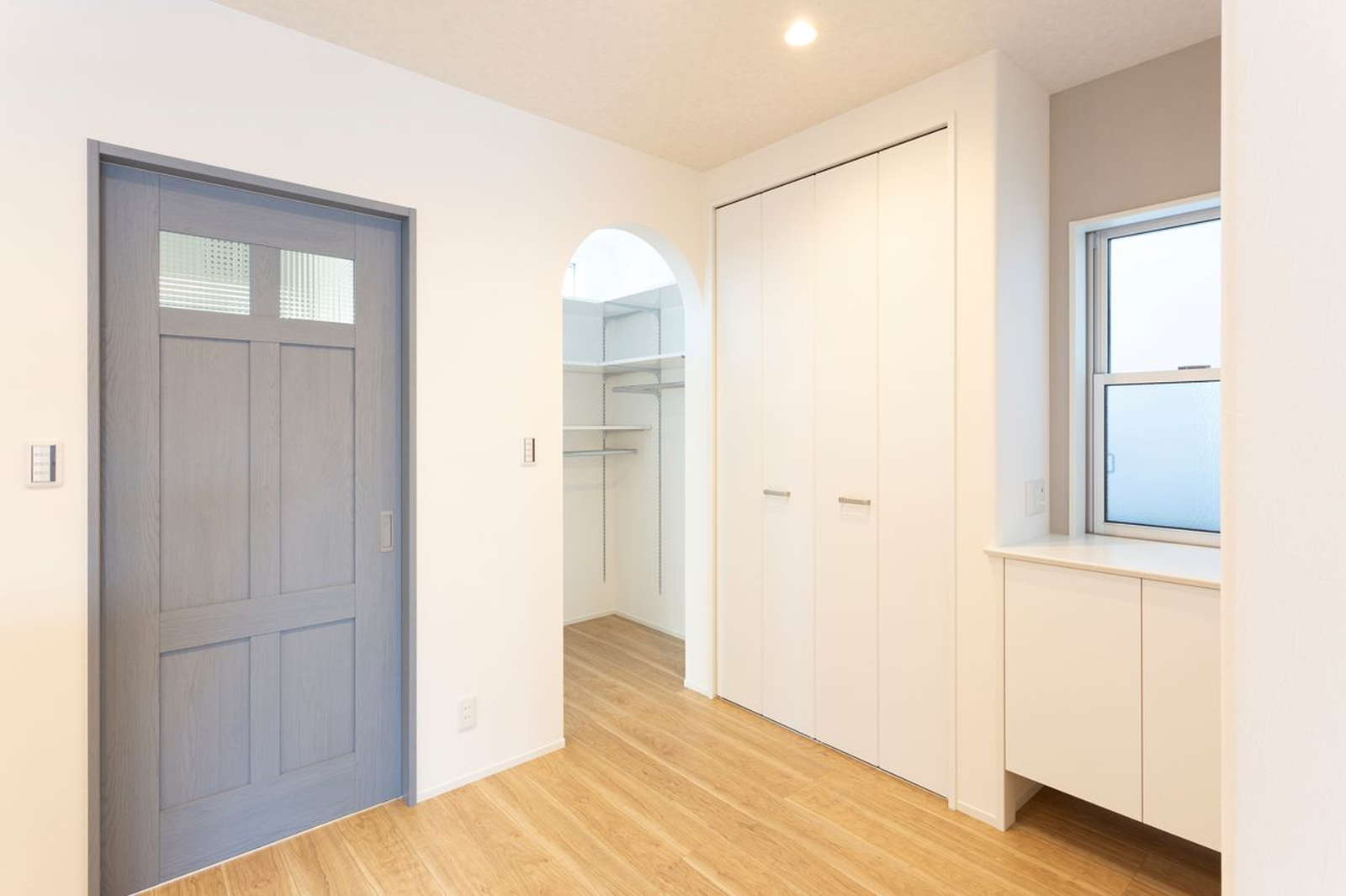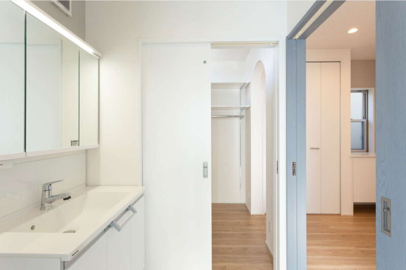 天井や壁、キッチンのクロスをホワイトで統一したことで、よりライトブルーが映えるお家に。洗面台とキッチンの間にある収納スペースはリネン類を収納できるだけでなく、そのまま浴室に繋がっているので家事導線もらくらく。入口が垂れ壁のアーチになっていて遊びゴコロも感じる内装に。