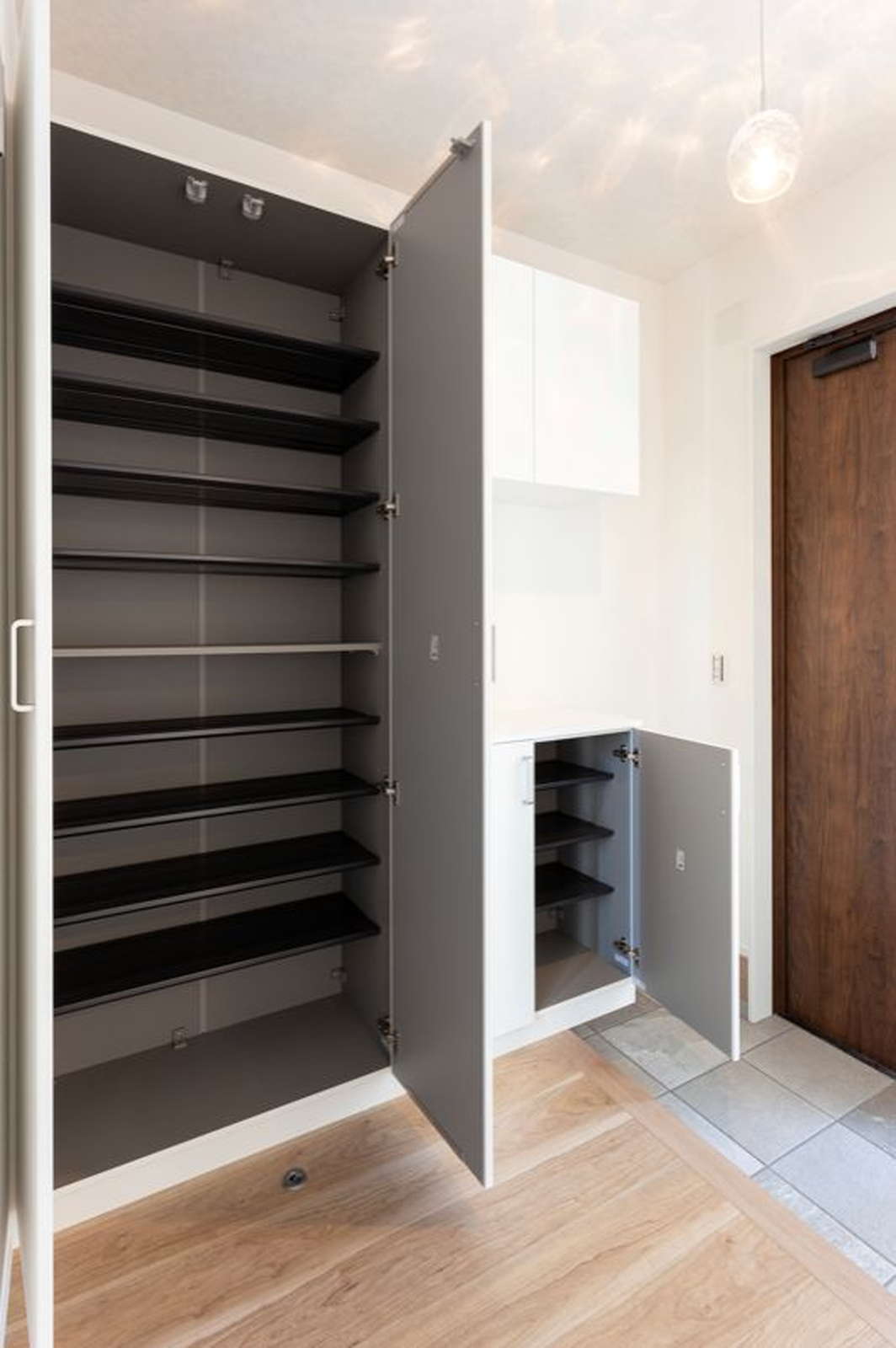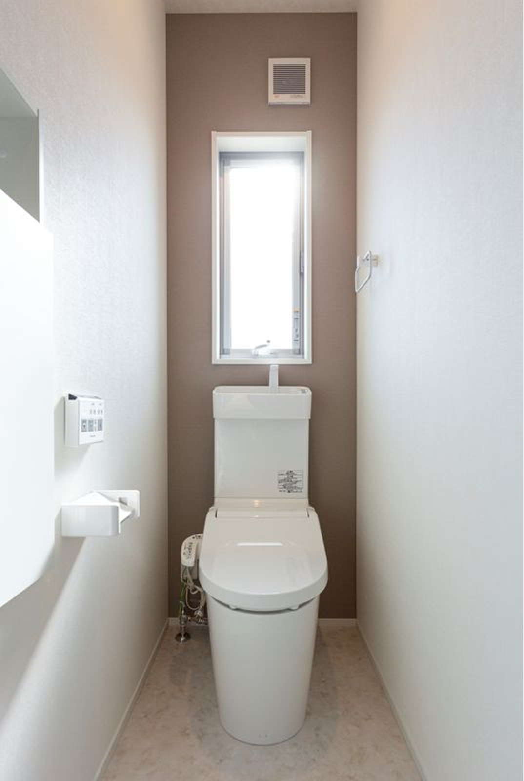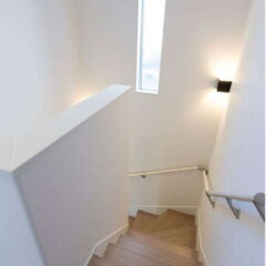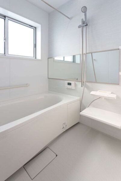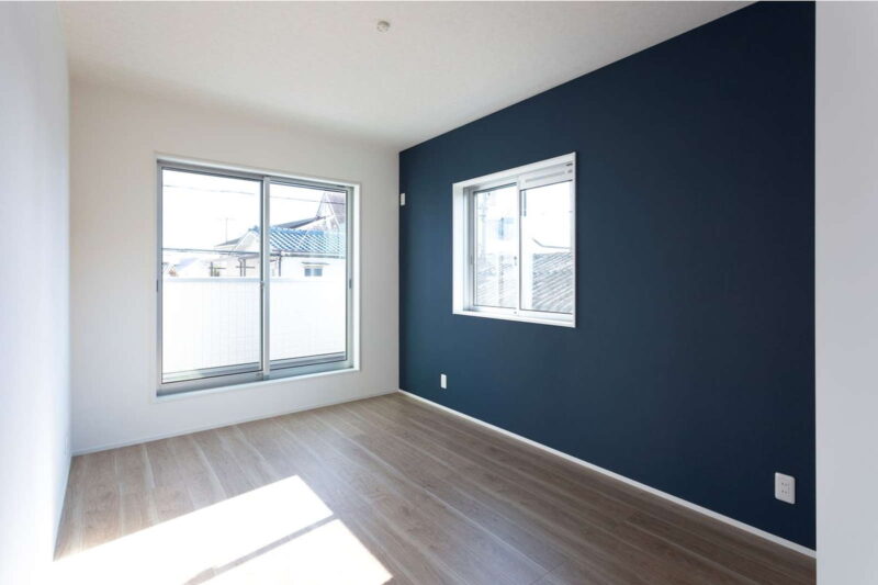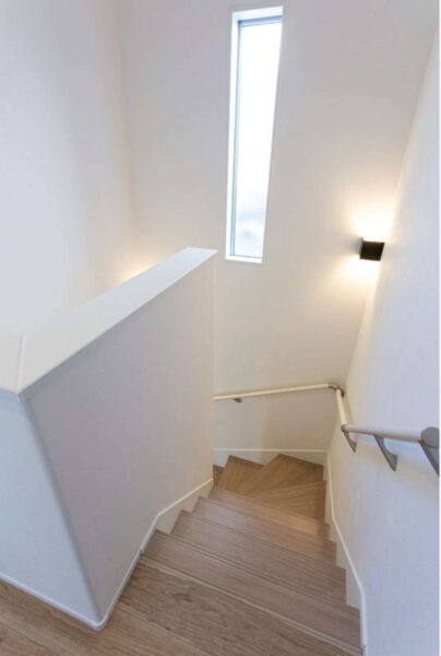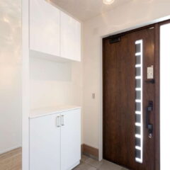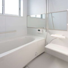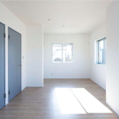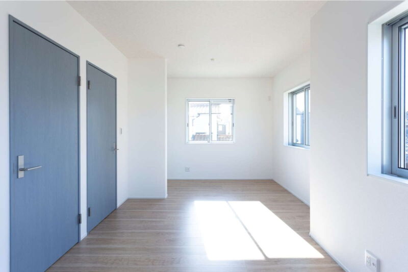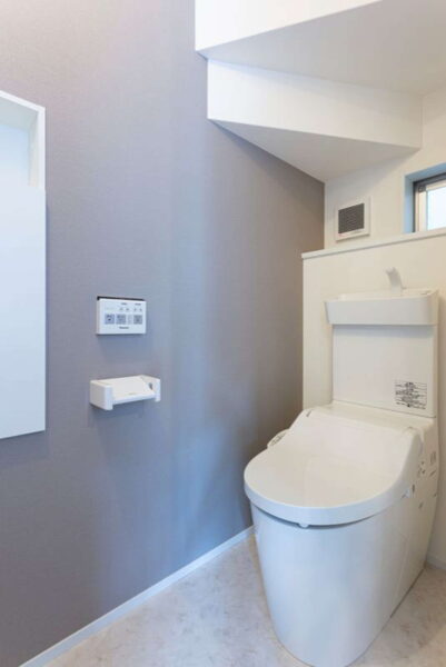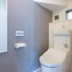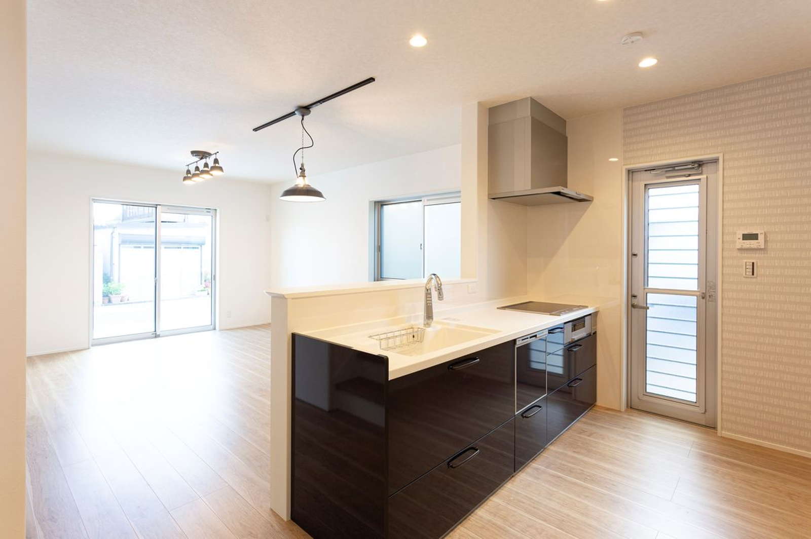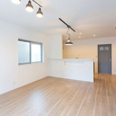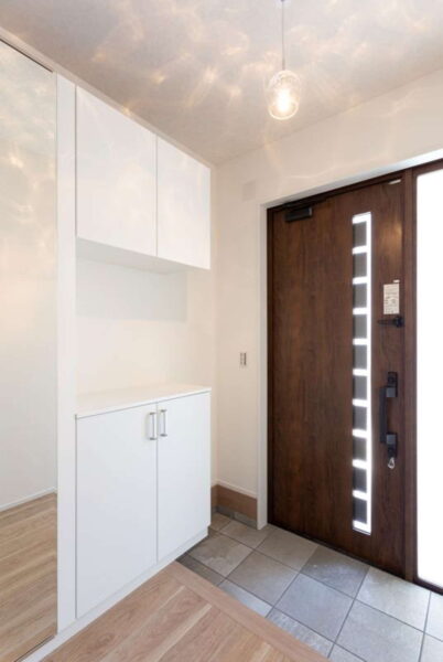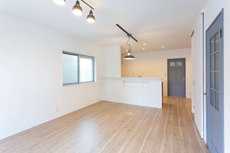 天井や壁、キッチンのクロスをホワイトで統一したことで、よりライトブルーが映えるお家に。洗面台とキッチンの間にある収納スペースはリネン類を収納できるだけでなく、そのまま浴室に繋がっているので家事導線もらくらく。入口が垂れ壁のアーチになっていて遊びゴコロも感じる内装に。