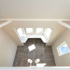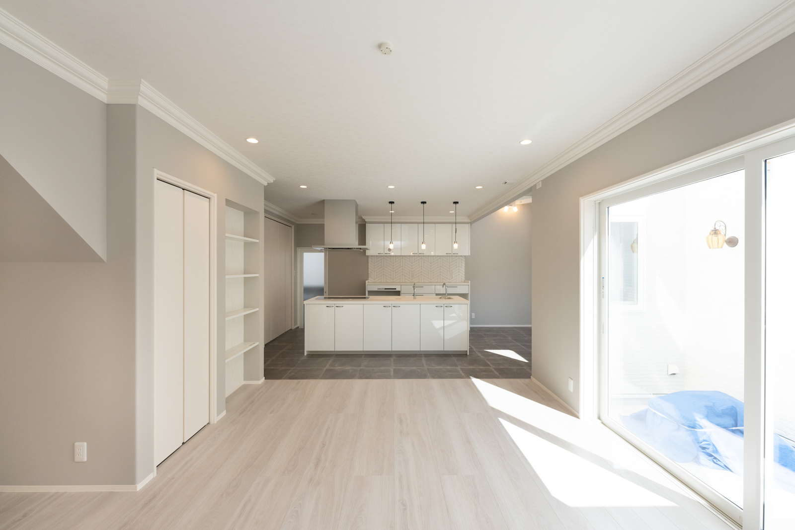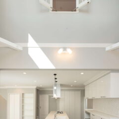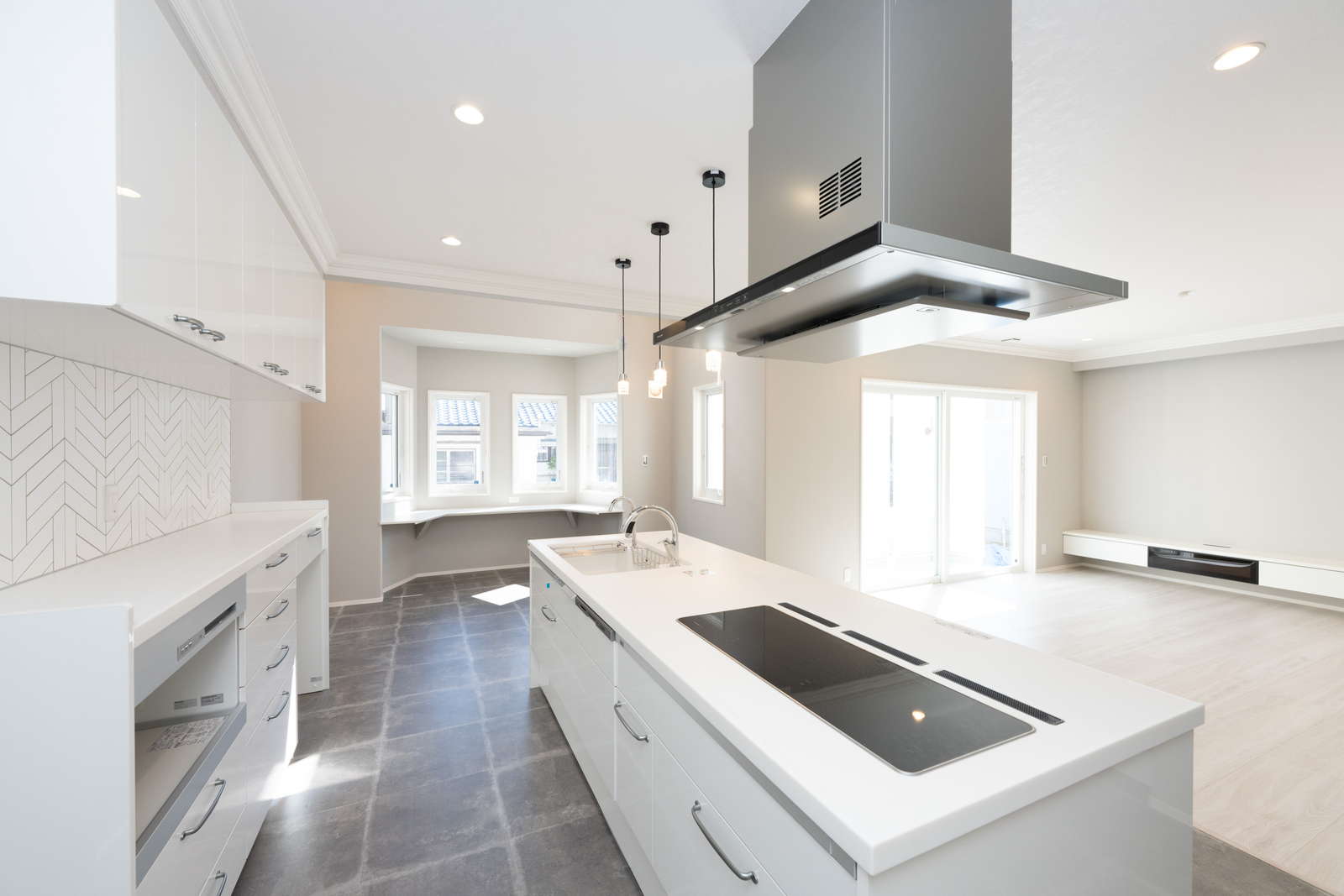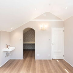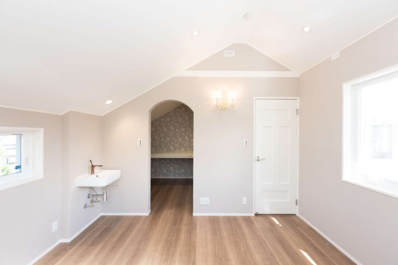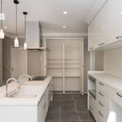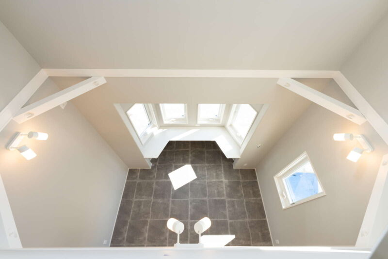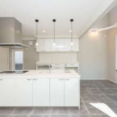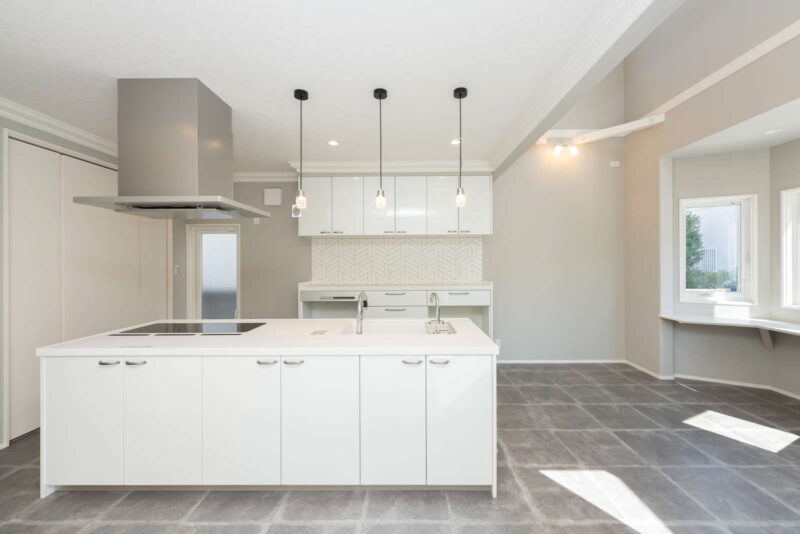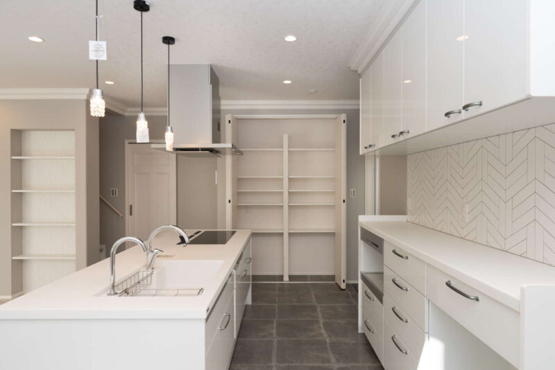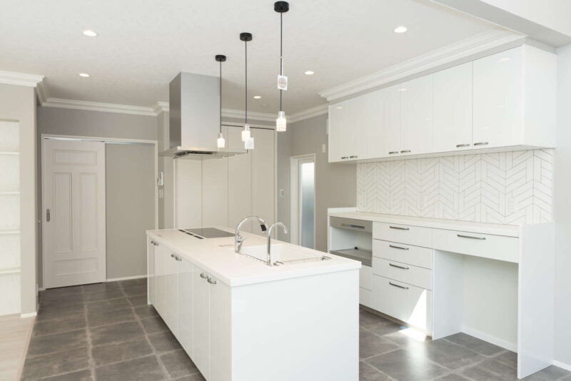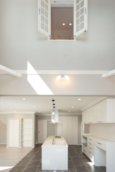 キッチン横が吹き抜けになっていて、そこから子供部屋の室内窓が見えるので、2階に居る子供の気配を感じながらお料理をしたり、家事に集中できます。さらに家事導線を考えたオープンなアイランドキッチンは、機能面はもちろん、開放感もあり、毎日のお料理が楽しくなりそう。