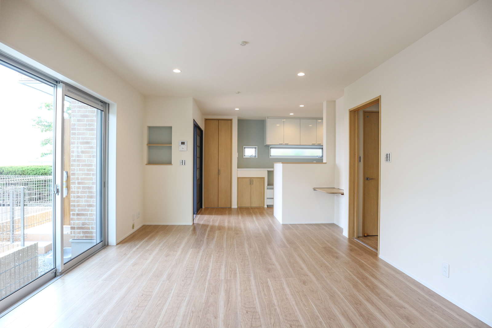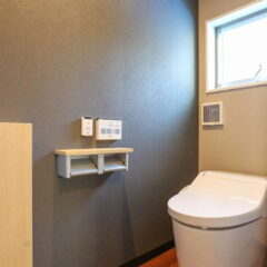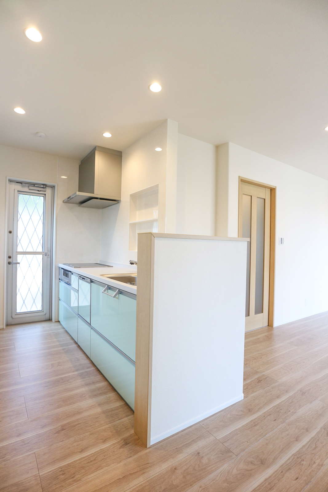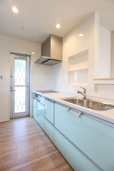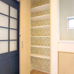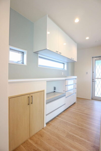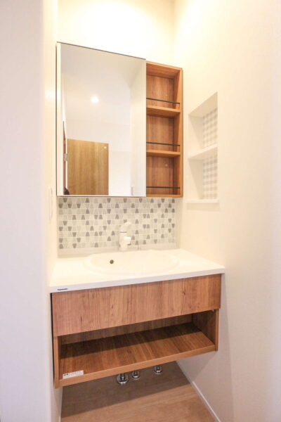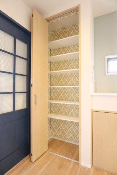 シンプルな内装の中にも、小さなこだわりがたくさん。小物を置ける可愛いニッチや、キッチン横のパントリーはお気に入りのクロスがちらり。洗面台は1階と2階の2か所に設置。忙しい朝は寝起きのまま2階で身支度が出来てしまうのもこだわりのひとつ。
