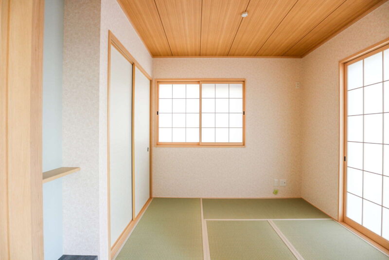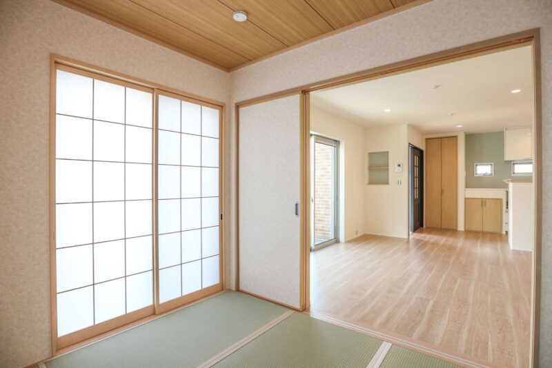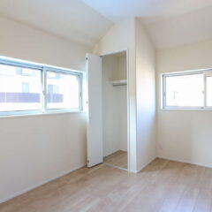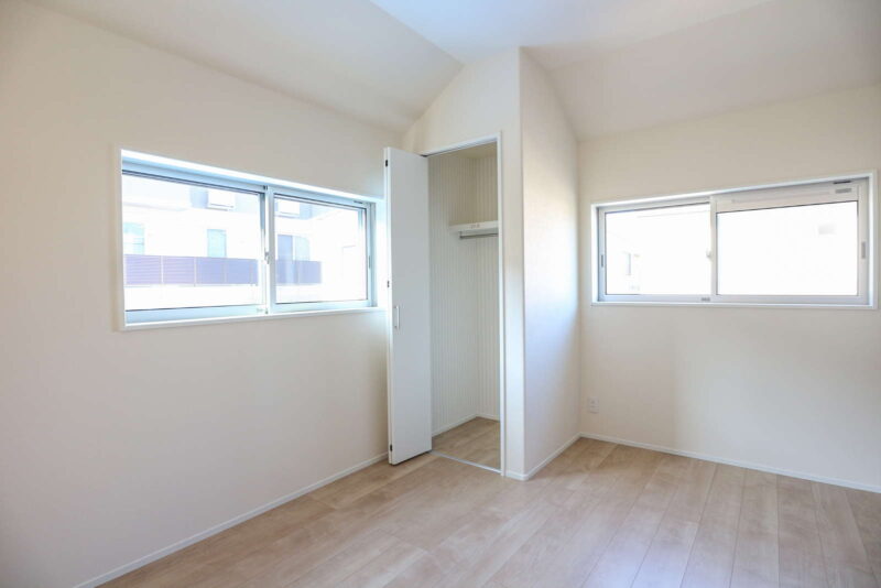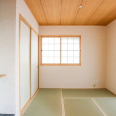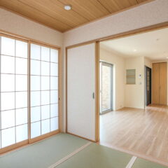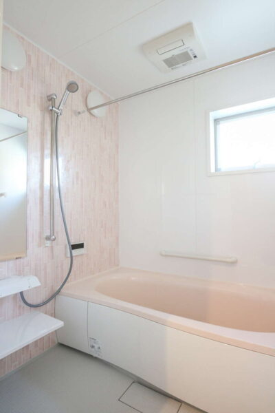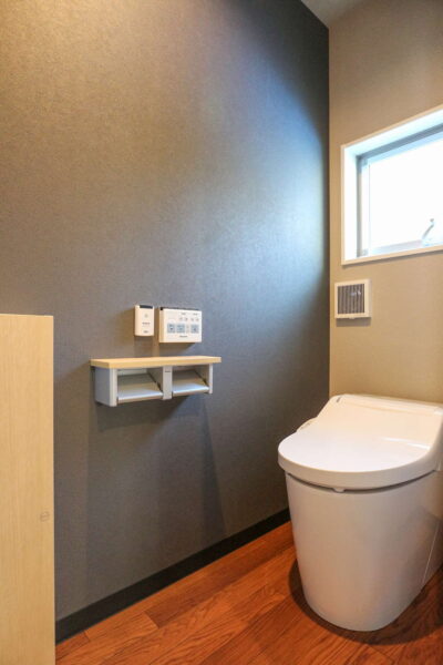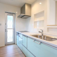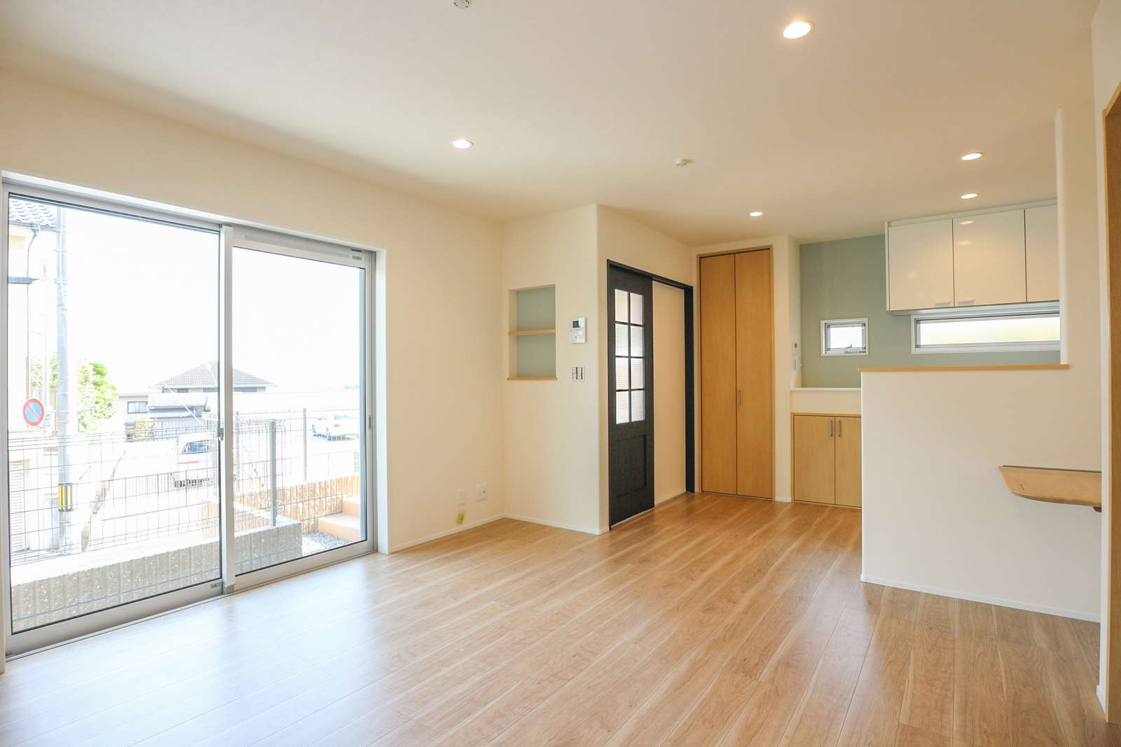 シンプルな内装の中にも、小さなこだわりがたくさん。小物を置ける可愛いニッチや、キッチン横のパントリーはお気に入りのクロスがちらり。洗面台は1階と2階の2か所に設置。忙しい朝は寝起きのまま2階で身支度が出来てしまうのもこだわりのひとつ。