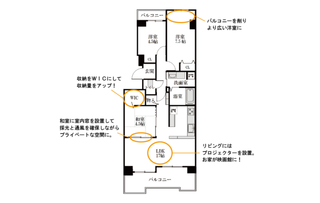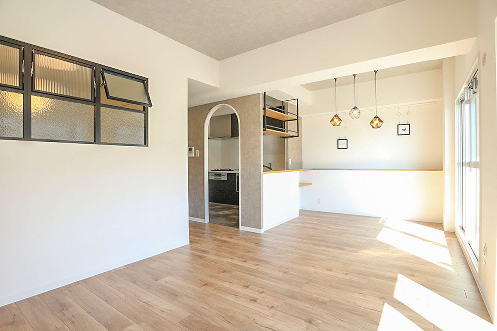 全室床・壁クロス張り替え、建具新調、和室畳張り替え、ユニットバス新調、洗浄機能付きトイレ新調 洗面化粧台新調、WIC新設、室内窓設置、システムキッチン新調、ホームプロジェクター設置、家具設置